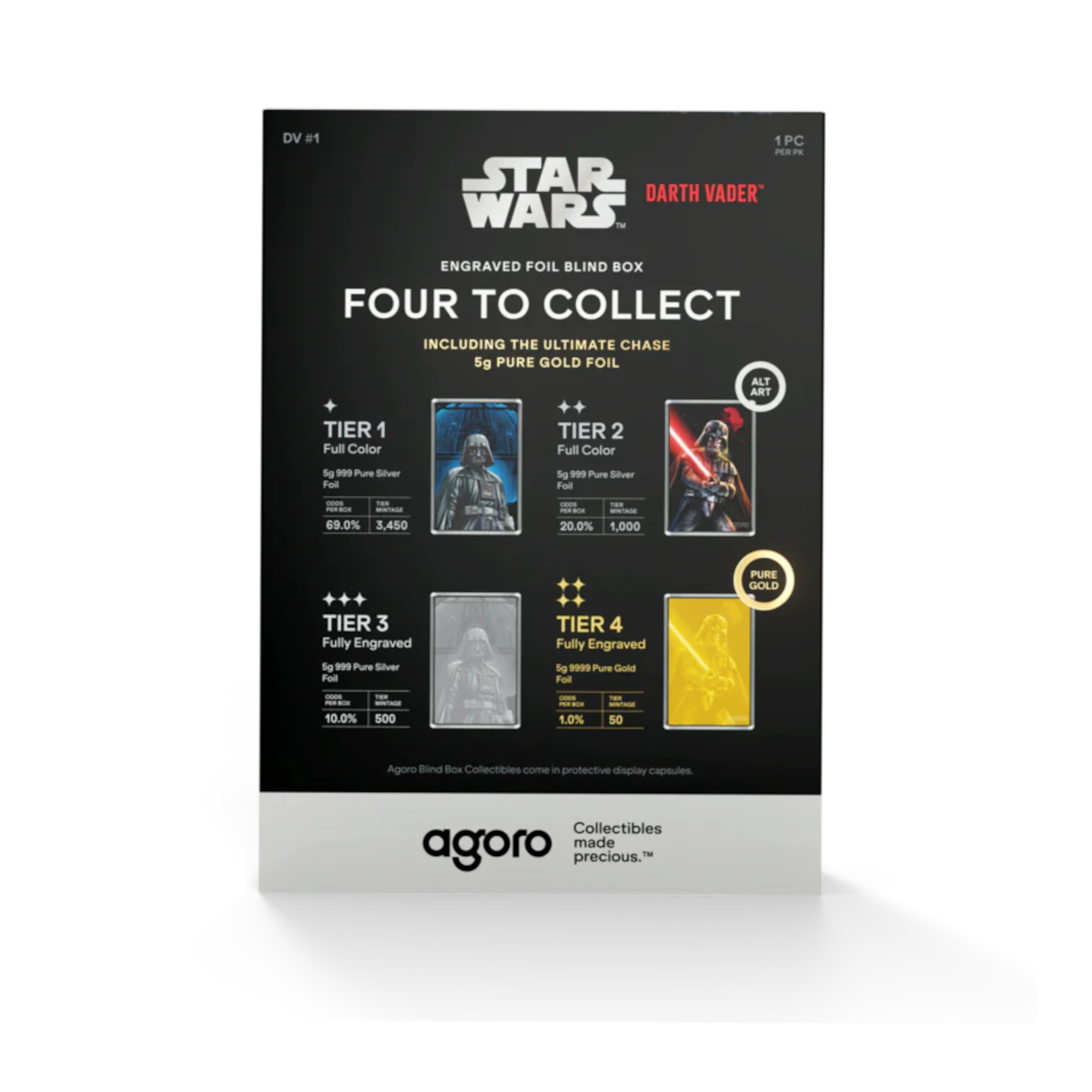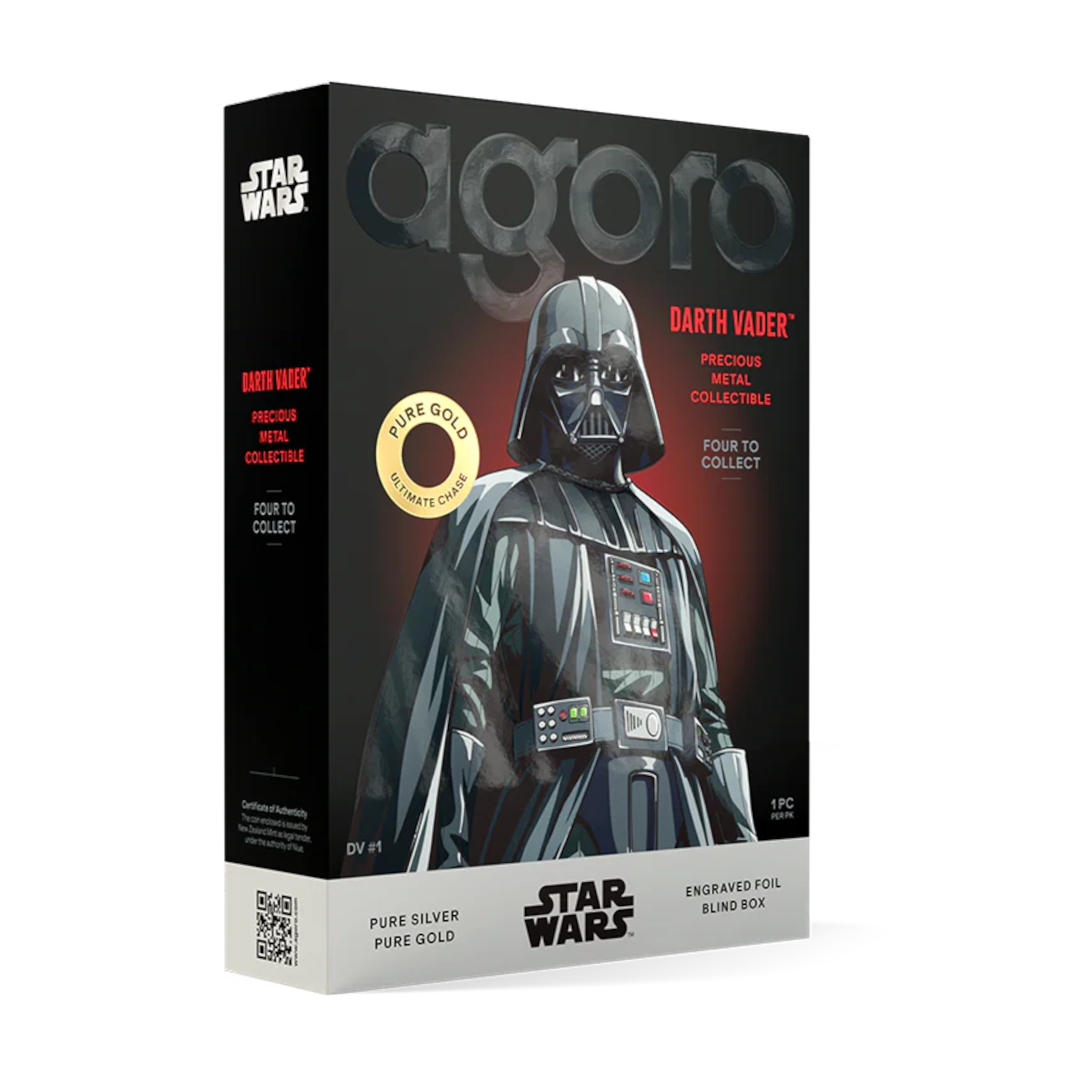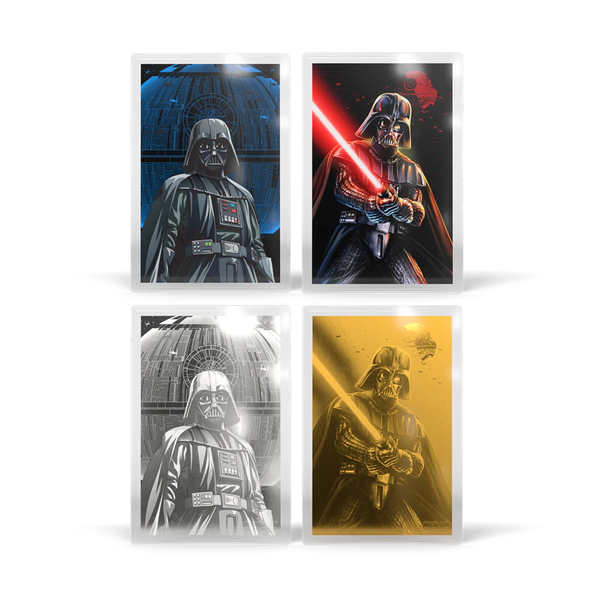 Coleccionable en caja ciega que contiene una de las cuatro láminas de edición limitada de 5 gramos acuñadas en plata pura u oro. Cada caja presenta diferentes niveles de rareza: el Nivel 1 (69% de probabilidad, 3.450 unidades) muestra a Darth Vader con la Estrella de la Muerte azul en colores vivos; el Nivel 2 (20% de probabilidad, 1.000 unidades) representa a Vader con el sable de luz activado en tonos rojos; el Nivel 3 (10% de probabilidad, 500 unidades) presenta plata totalmente grabada; el Nivel 4 (1% de probabilidad, 50 unidades) incluye una lámina de oro de 24k ultrarrara. El anverso muestra el Sello Público de Niue con número de serie individual. Limitado a 5.000 cajas en todo el mundo. Empaquetado en cápsula acrílica con funda de la marca Star Wars.