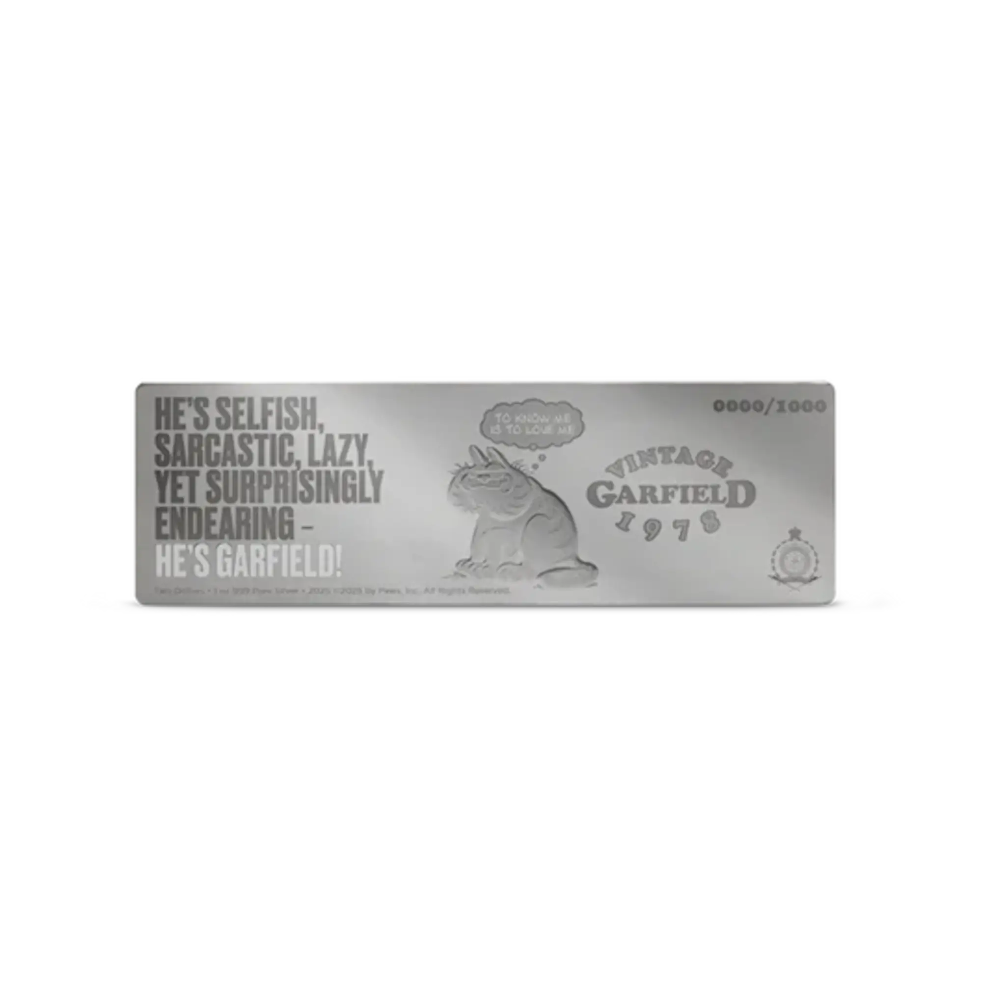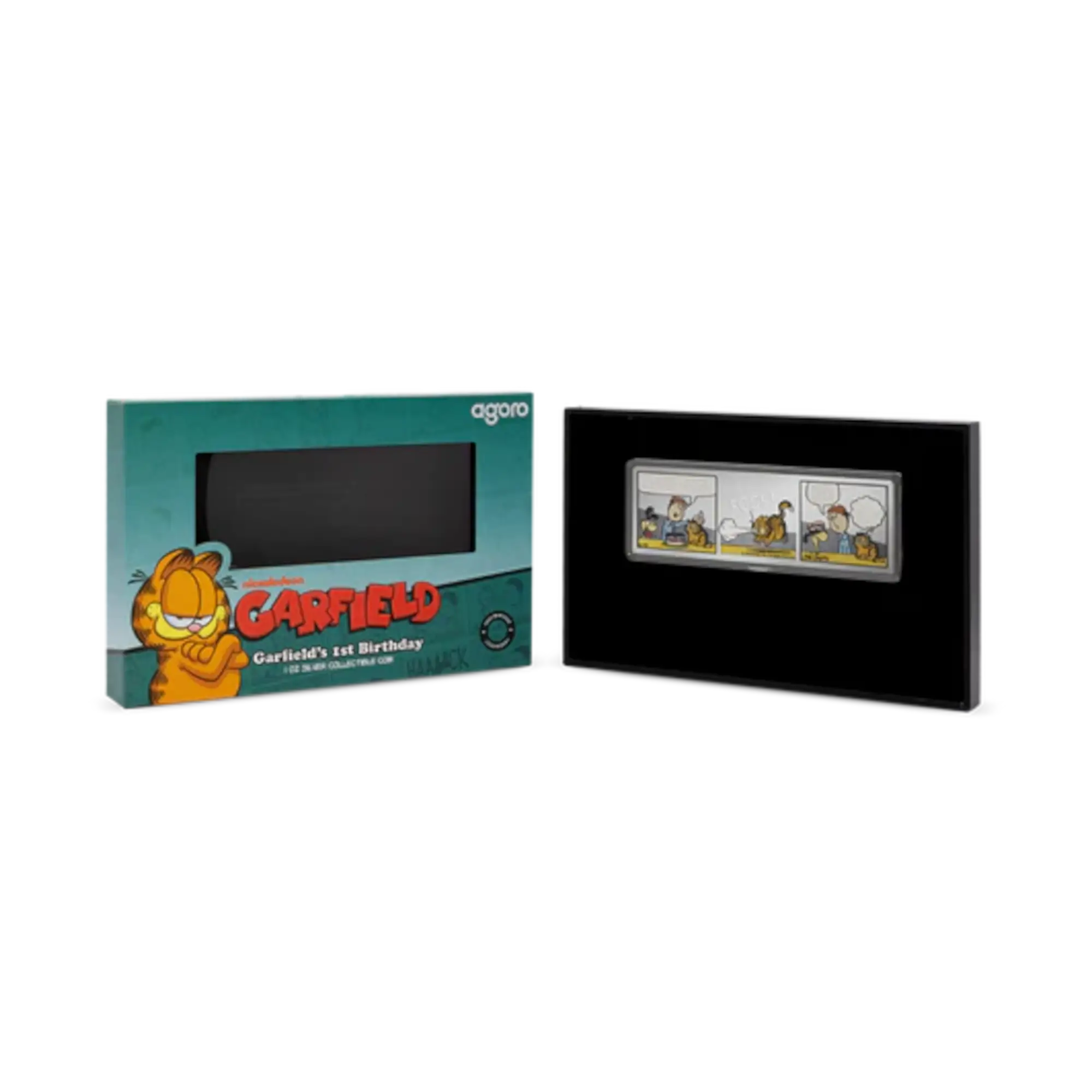 Moneda proof coloreada de plata .999 de 1 oz. Reverso: tira cómica del primer cumpleaños de Garfield del 19 de junio de 1979 a todo color mostrando al gato atigrado naranja obsesionado con la tarta atormentando a Odie, bocadillos de diálogo en acabado espejo y glaseado sobre fondo en acabado espejo. Anverso: detalles escarchados rindiendo homenaje a Garfield con imágenes y palabras adicionales, Sello Público de Niue, «TWO DOLLARS», «2025», «1 oz 999 PURE SILVER», número de serie individual. Primer coleccionable de Garfield de Agoro. Creado por Jim Davis en 1978, Garfield se convirtió en fenómeno cultural por su personalidad odiadora de los lunes y amante de la lasaña. Edición limitada de 1000 piezas en todo el mundo. Estuche de presentación con ventana de la marca Garfield, Certificado de Autenticidad incluido.