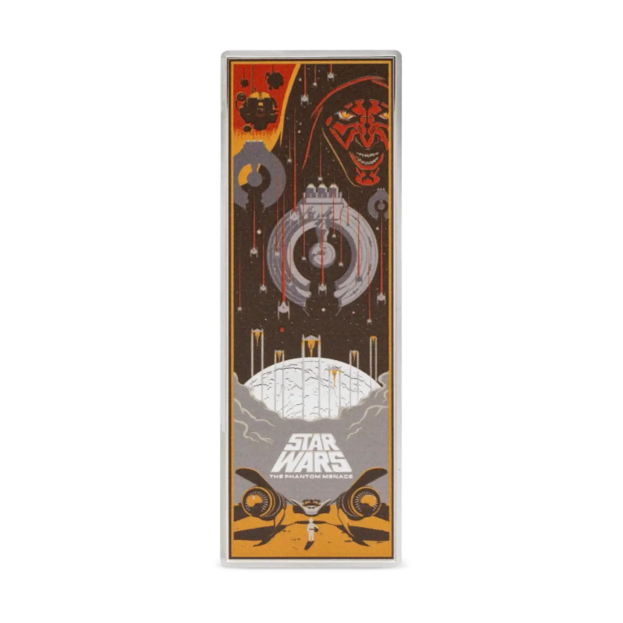Cuarta entrega de la serie Star Wars Poster, esta moneda rectangular presenta el vibrante arte del póster de La Amenaza Fantasma con Qui-Gon Jinn, Obi-Wan Kenobi, Padmé Amidala y Darth Maul a todo color. Acuñada en plata pura del 99,9 % con acabado proof, el diseño combina la impresión en color con grabados mate, elementos con acabado espejo y detalles en alto relieve. El reverso muestra el texto introductorio de la película en acabado mate bajo el Sello Público de Niue. Tirada limitada de 800 monedas. Se presenta en una caja exterior de la marca Star Wars con un Certificado de Autenticidad que incluye el número único de la moneda.