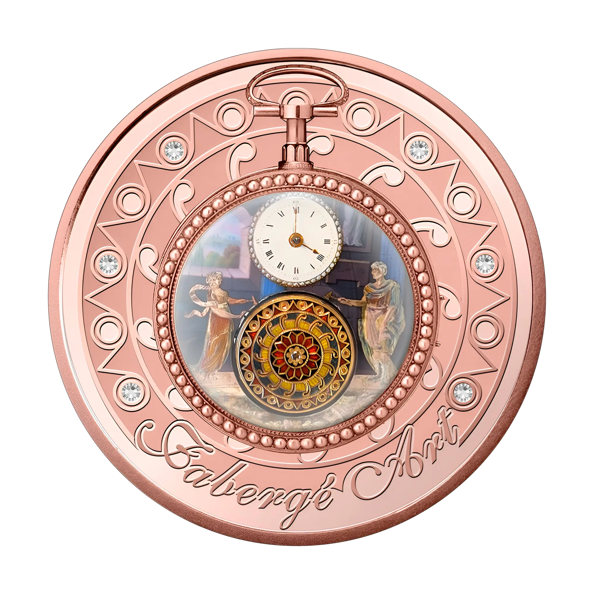 Una pieza de colección de plata de 1 oz de la serie «Fabergé Art» de Niue, diseñada en torno a un motivo de reloj de bolsillo ornamentado. Presenta una coloración detallada, detalles de chapado en oro de 24k y un inserto de cristal, presentada en un estuche de lujo con un Certificado de Autenticidad. Con una acuñación estrictamente limitada, está dirigida a compradores de regalos y coleccionistas que priorizan la artesanía y la presentación, sin dejar de conservar su valor de metal precioso en su esencia.