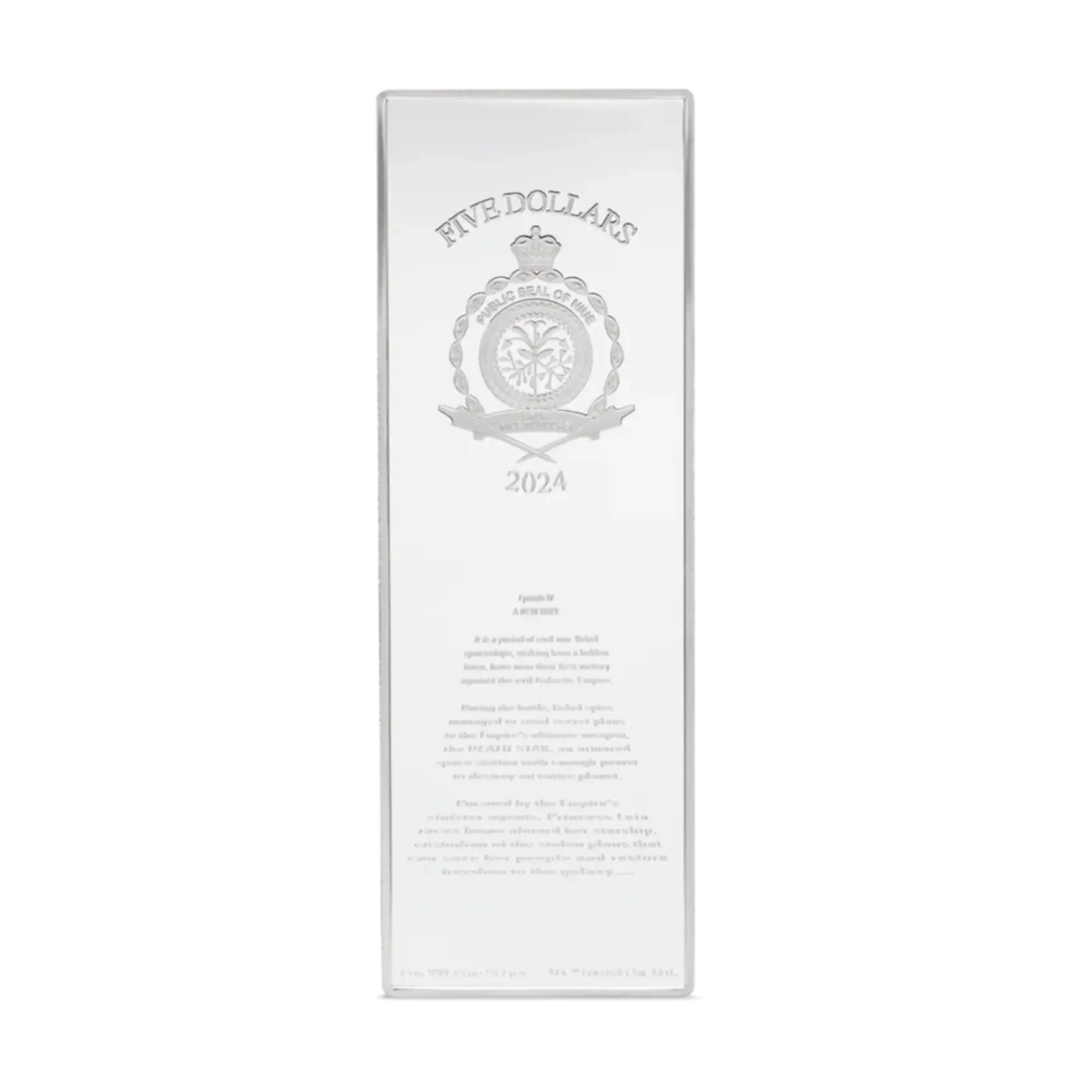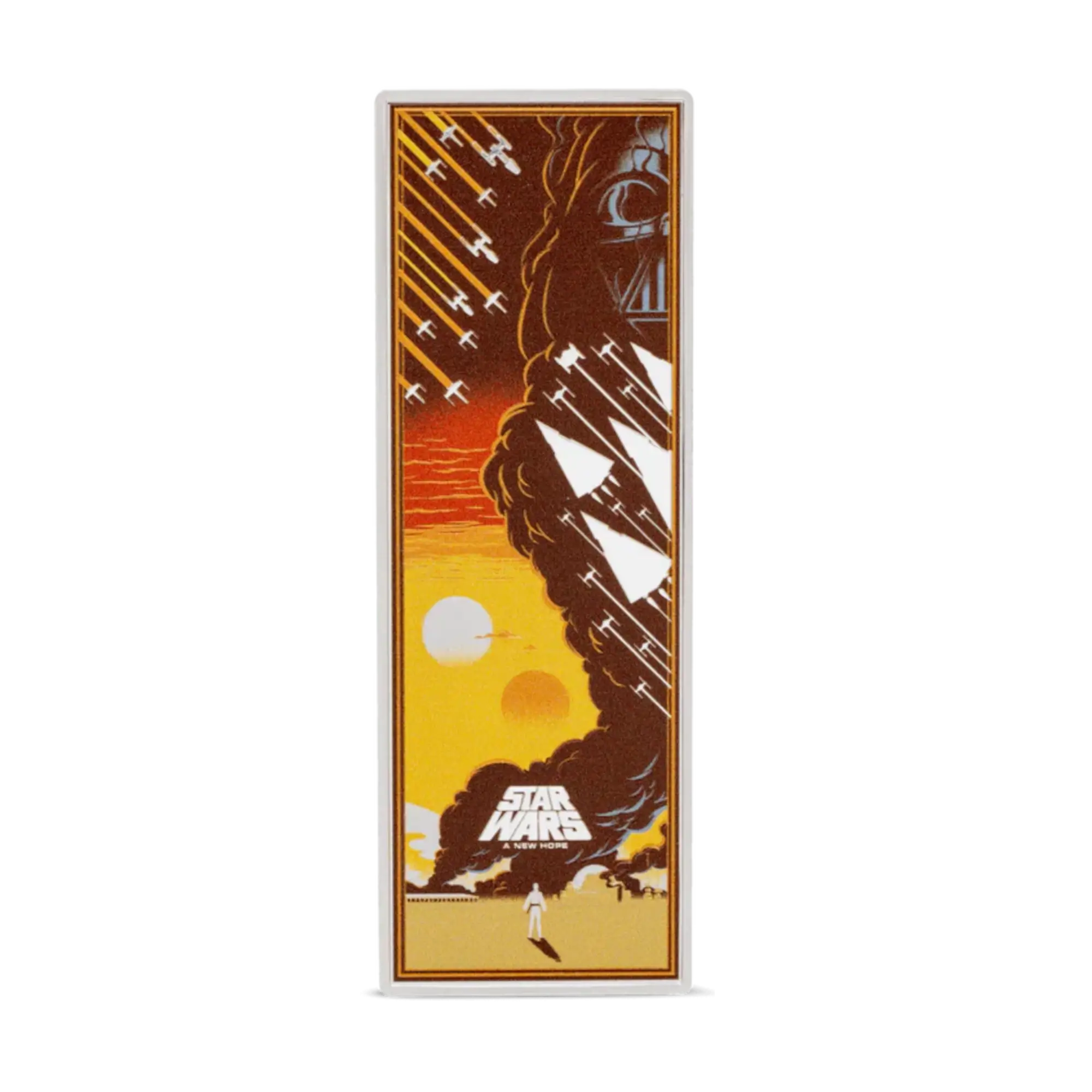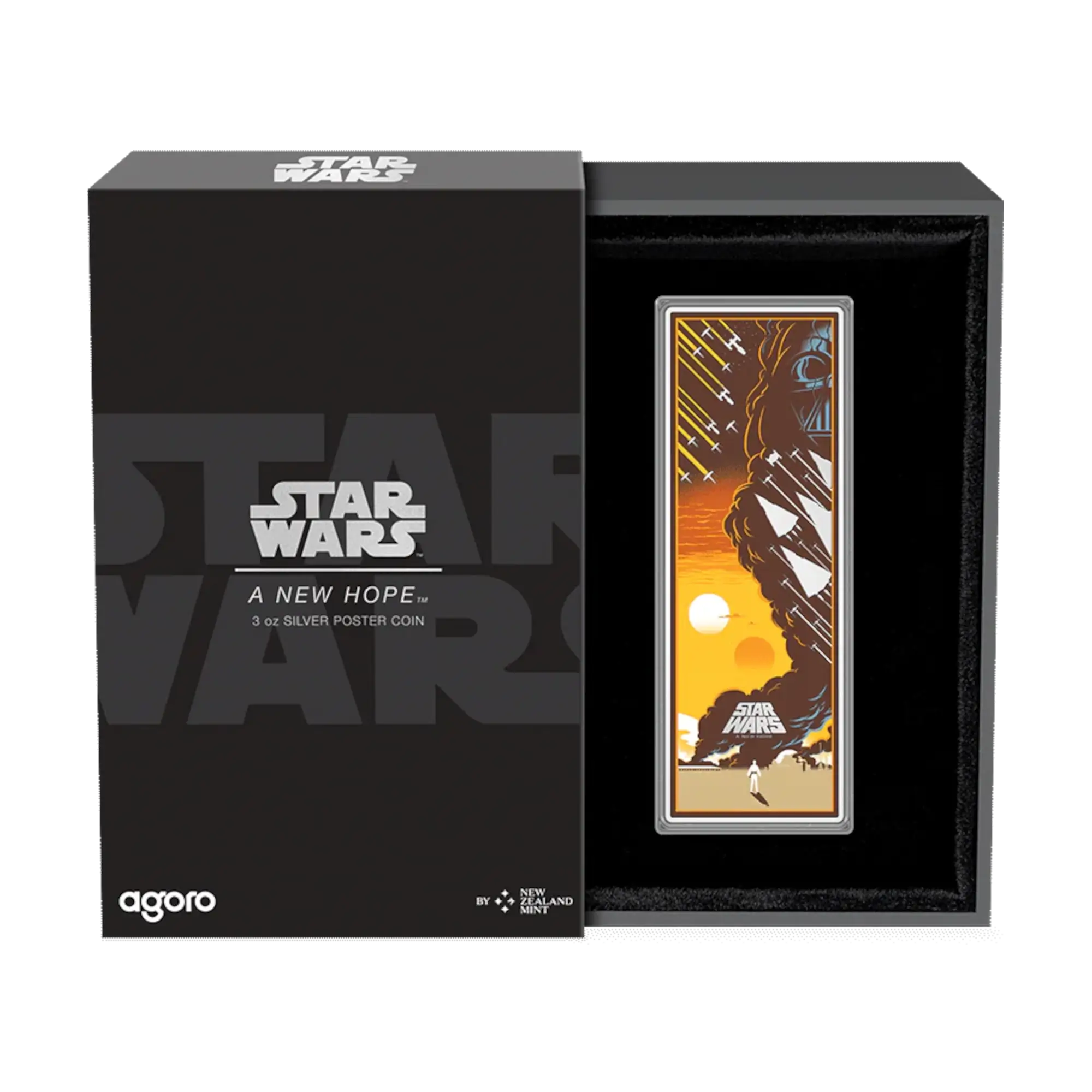 Primer lanzamiento de la nueva serie de monedas póster de plata de 3 oz que celebra la película de 1977 Star Wars: Episodio IV – A New Hope. Moneda proof rectangular a color con vibrantes ilustraciones de Eric Tan, creadas originalmente para el evento Star Wars Celebration de 2019. El reverso muestra la icónica imagen del póster de la película con cazas TIE Imperiales, cazas estelares X-Wing Rebeldes, Darth Vader, Luke Skywalker en el desierto de Tatooine, el título de Star Wars y el logotipo de la película en acabado espejo que contrasta con la obra de arte a color. El anverso presenta el Sello Público de Niue con el texto de apertura de la película grabado en acabado esmerilado. Edición limitada a 800 unidades en todo el mundo. Incluye embalaje con la marca Star Wars forrado en terciopelo y Certificado de Autenticidad con número de serie único.