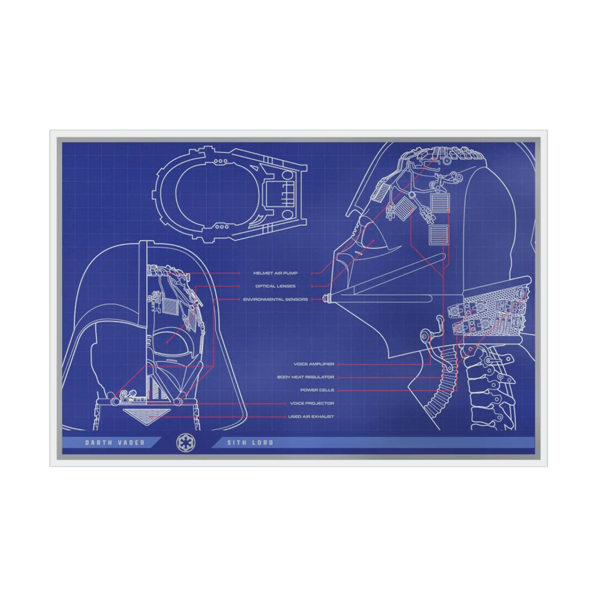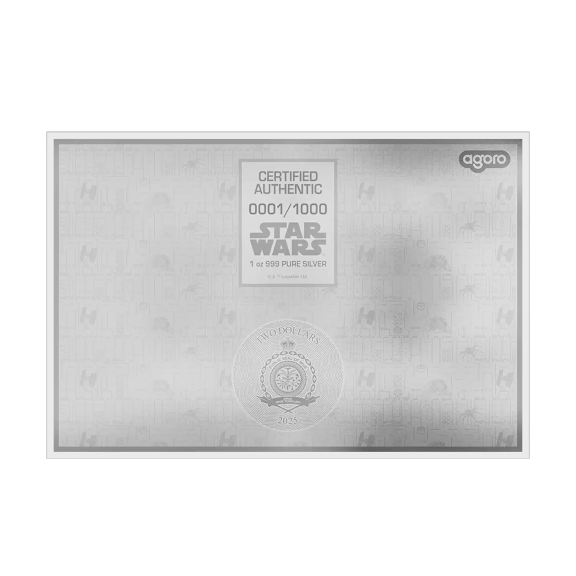 Tarjeta moneda de lámina de plata de 1 oz .999 con unas dimensiones de 175 mm x 262 mm (aproximadamente 10 pulgadas de ancho por 7 pulgadas de alto), acabado proof con color. Anverso: Escudo del Sello Público de Niue, logotipo de Star Wars, numeración de serie individual, gráficos técnicos y esquemas de equipo. Reverso: grabados detallados en mate que muestran múltiples vistas y capas técnicas del icónico casco de Darth Vader sobre un fondo azul vibrante con detalles en rojo, símbolo del Imperio Galáctico y nombre de Darth Vader. Tercera entrega de la serie Star Wars Blueprint. Con licencia de Lucasfilm, acuñada por la New Zealand Mint (Agoro) para Niue, valor nominal de 2 $. Muestra las lentes ópticas y los sistemas de proyección de voz. Limitada a 1.000 piezas en todo el mundo. Embalaje compacto de la marca Star Wars con certificado de autenticidad.