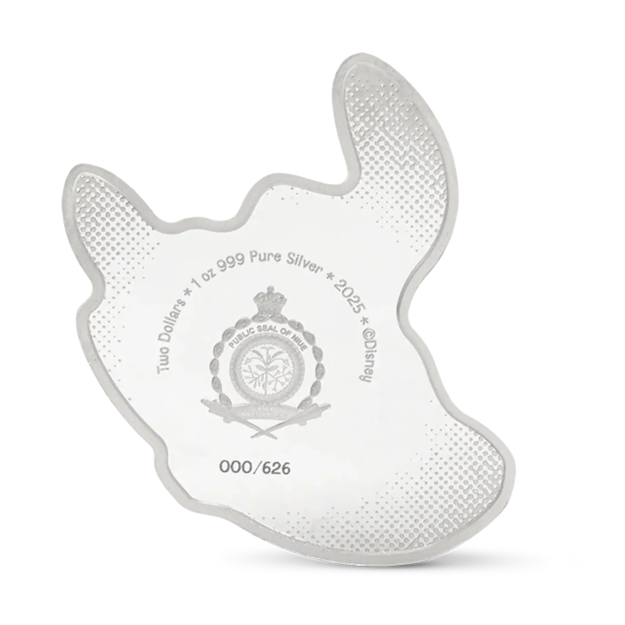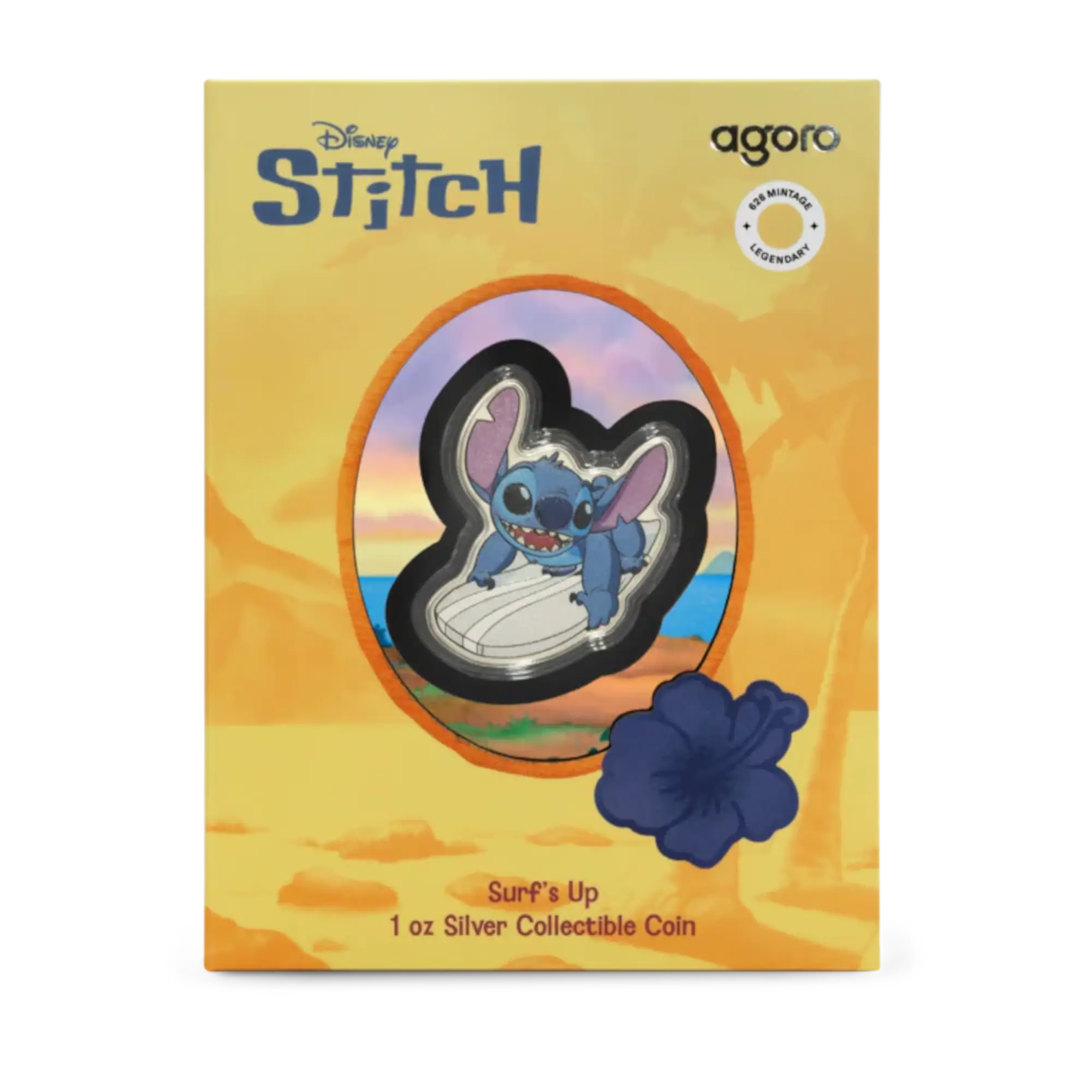 Moneda proof de plata ,999 de 1 oz con forma, color y canto mate. Reverso: Stitch surfeando con energía salvaje, diseño en color con dos franjas grabadas con acabado espejo en la tabla. Anverso: Sello Público de Niue con patrón mate y acabado espejo, «TWO DOLLARS», «1 oz 999 PURE SILVER», «2025», copyright de Disney y número de serie individual. Tercer lanzamiento de Agoro en celebración del Experimento 626. Rinde homenaje al 26 de junio, el «Día de Stitch», celebrando al querido personaje de la película de Disney de 2002 que aprende el concepto hawaiano de ohana (familia) a través de su amistad con Lilo en Kauai. Limitada a 626 piezas en todo el mundo. Embalaje de temática hawaiana y Certificado de Autenticidad incluido.