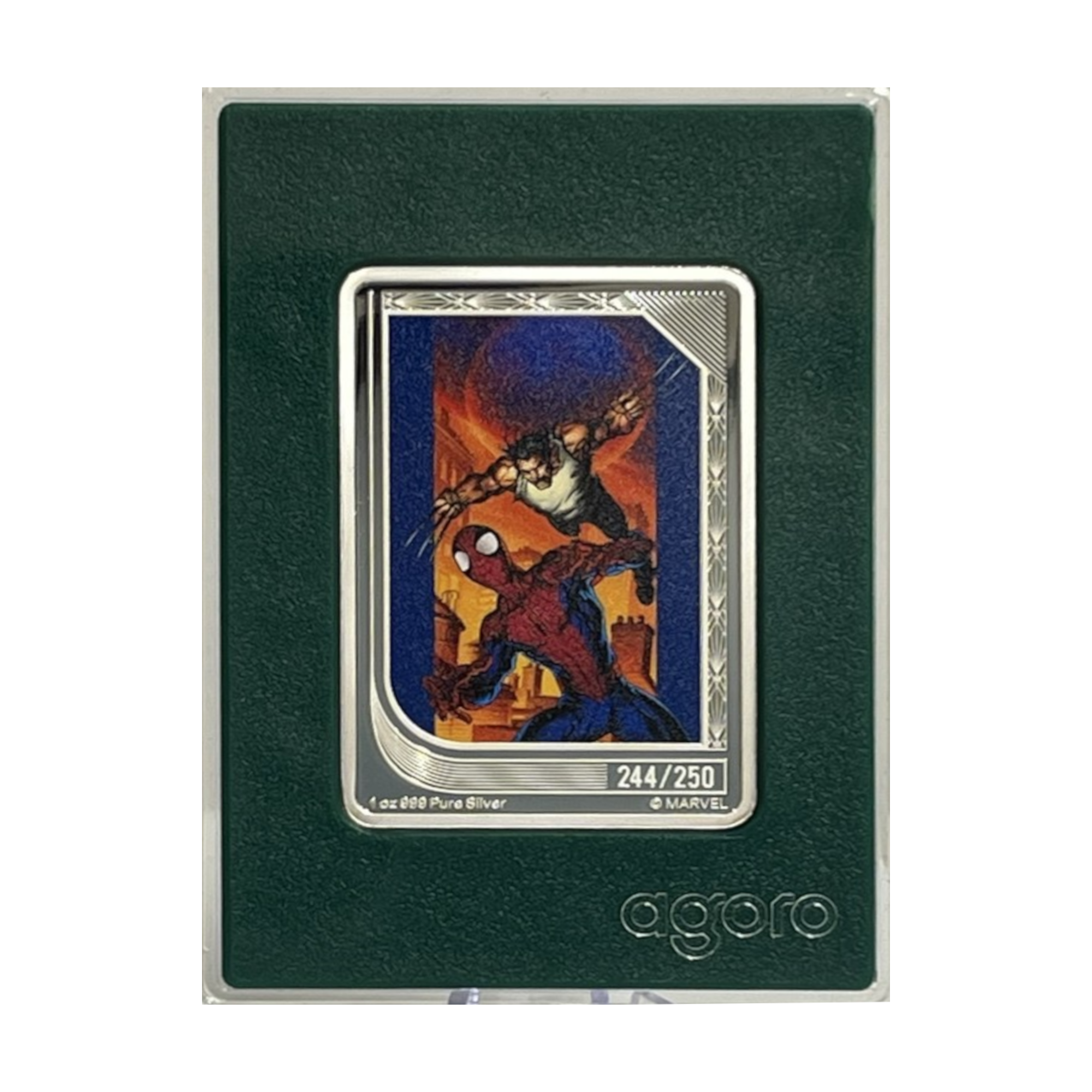 Parte de la serie The Art of Marvel Comics Trading Coins de Agoro, esta moneda de plata de 1 oz representa a Wolverine y Spider‑Man en el anverso con un estilo artístico inspirado en los cómics, resaltando la acción y el contraste entre ambos personajes. El reverso presenta elementos temáticos complementarios de Marvel, junto con el escudo de Niue y la denominación. La moneda viene en cápsula protectora con Certificado de Autenticidad e incluye empaquetado temático. Emerald Mintage es una edición rara de solo 250 piezas, siendo esta la #244 de 250.