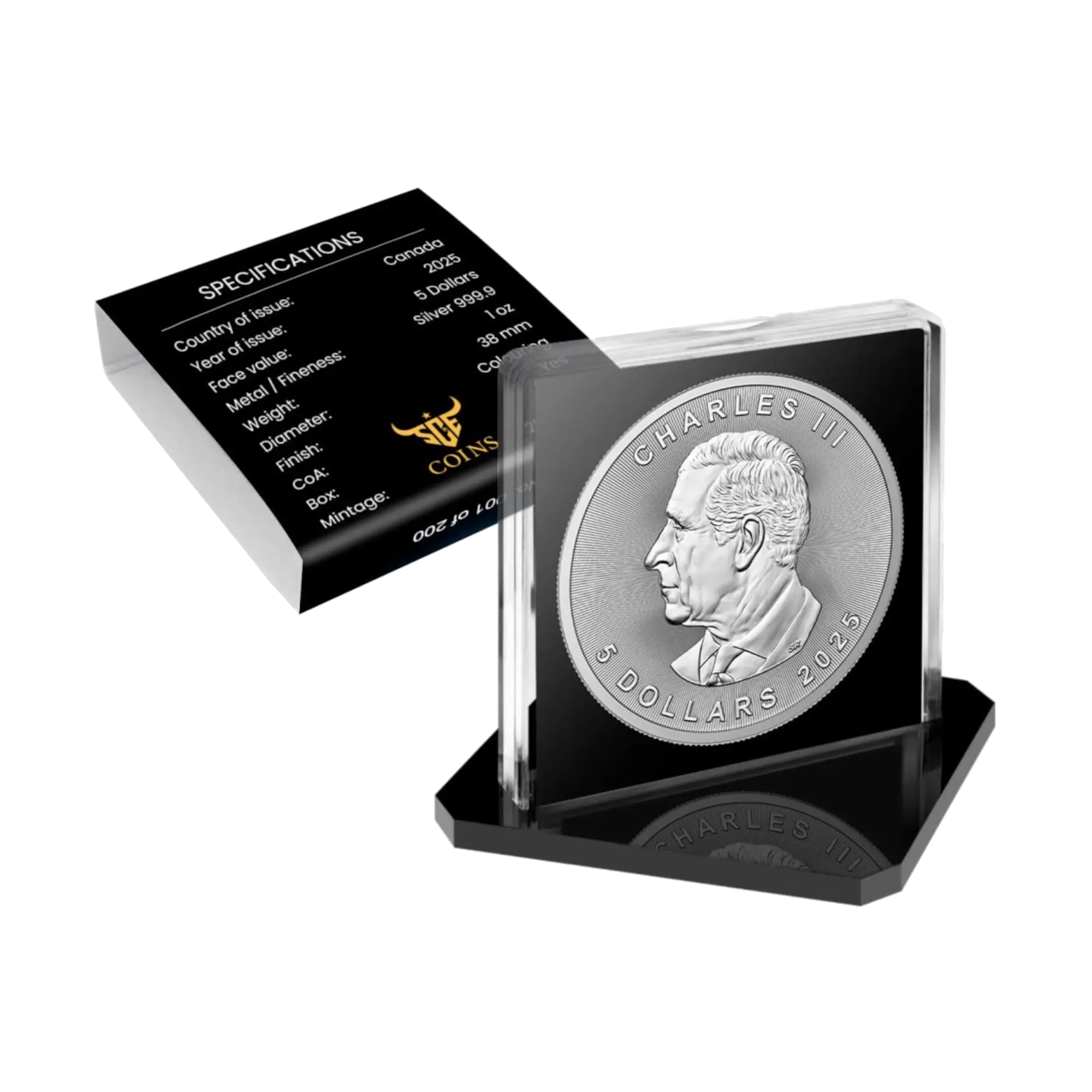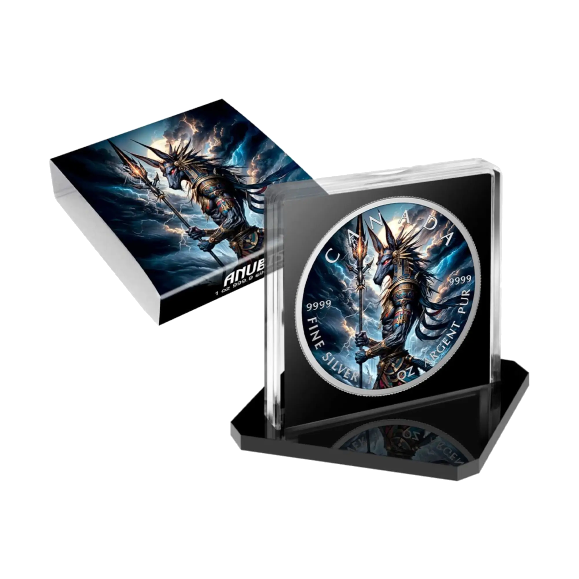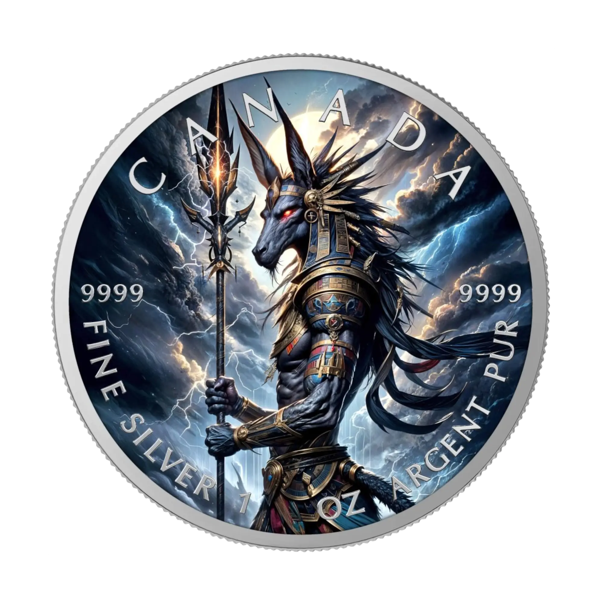 1 oz .9999 silver colorized coin with brilliant uncirculated finish. Obverse: iconic Canadian maple leaf reimagined with Anubis depicted in vivid UV digital color against silver background, jackal-headed deity in regal posture wearing ancient attire, “CANADA,” “9999 FINE SILVER 1 OZ ARGENT PUR.” Reverse: King Charles III effigy in frosted finish contrasting with mirrored field, “5 DOLLARS,” “2025.” Produced by Asturmint. Anubis served as ancient Egyptian deity of mummification and afterlife, guiding souls through underworld and weighing hearts against Ma’at’s feather of truth in judgment. Limited 200 pieces worldwide. Quadrum capsule, matching COA sleeve included.