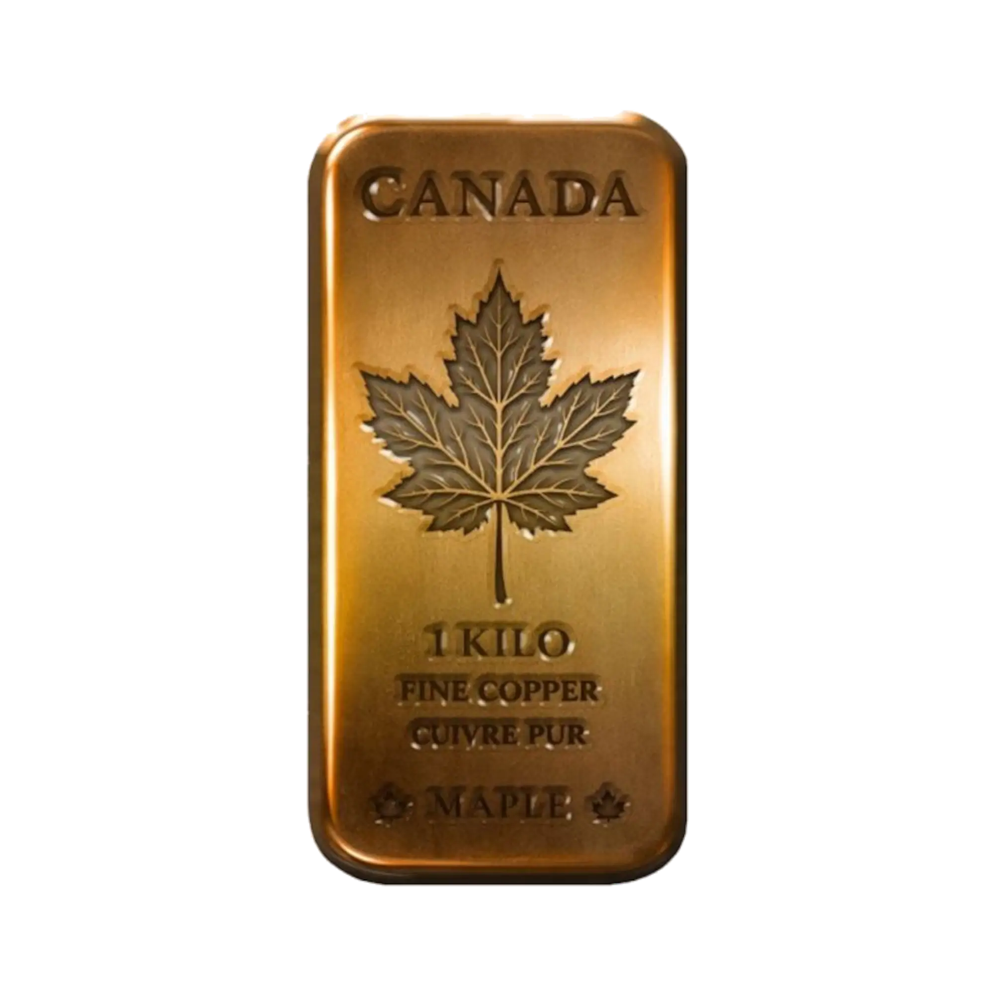 Copper bullion bar containing 1 kilogram (32.15 troy oz) .999 fine copper. Features iconic Canadian sugar maple leaf design, national emblem symbolizing Canada’s natural heritage and national identity. Obverse displays detailed maple leaf with “CANADA” inscription and purity markings. Brilliant finish highlighting copper’s natural luster and reddish tone