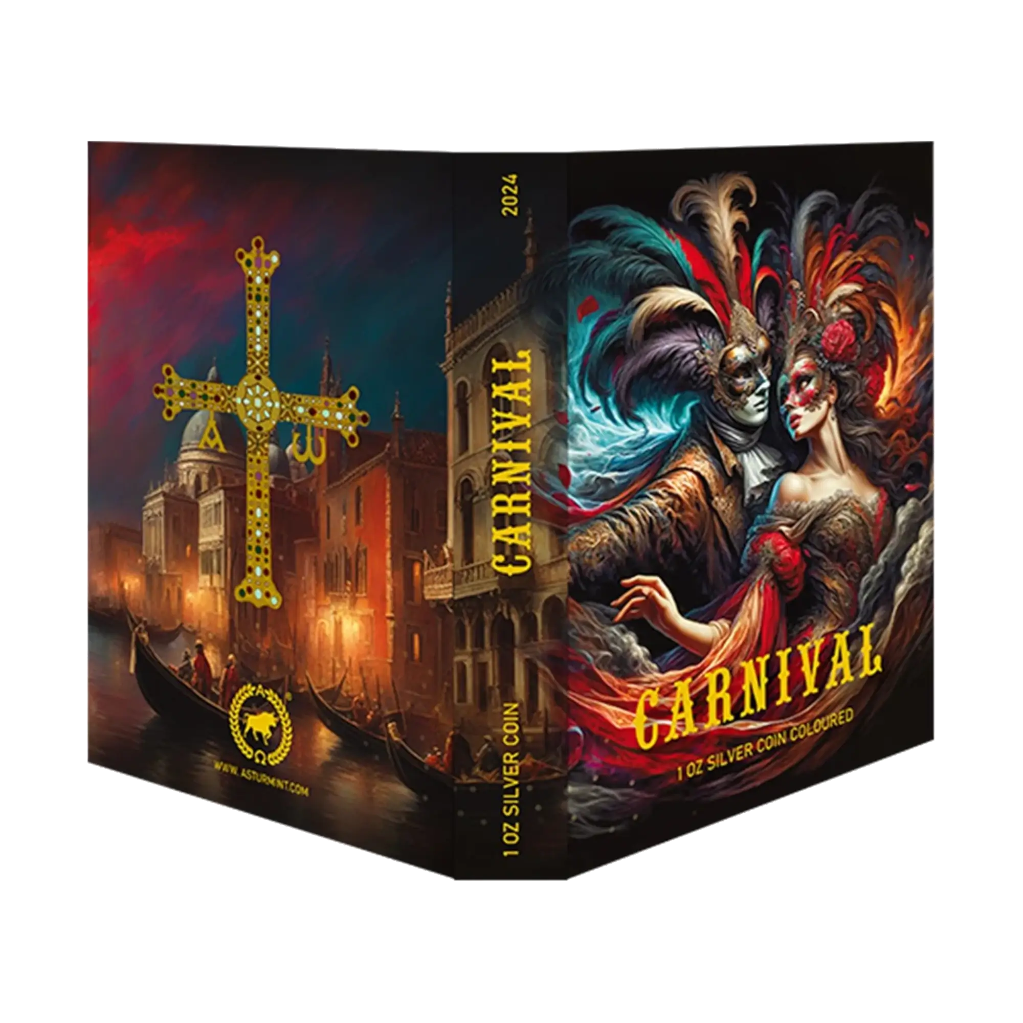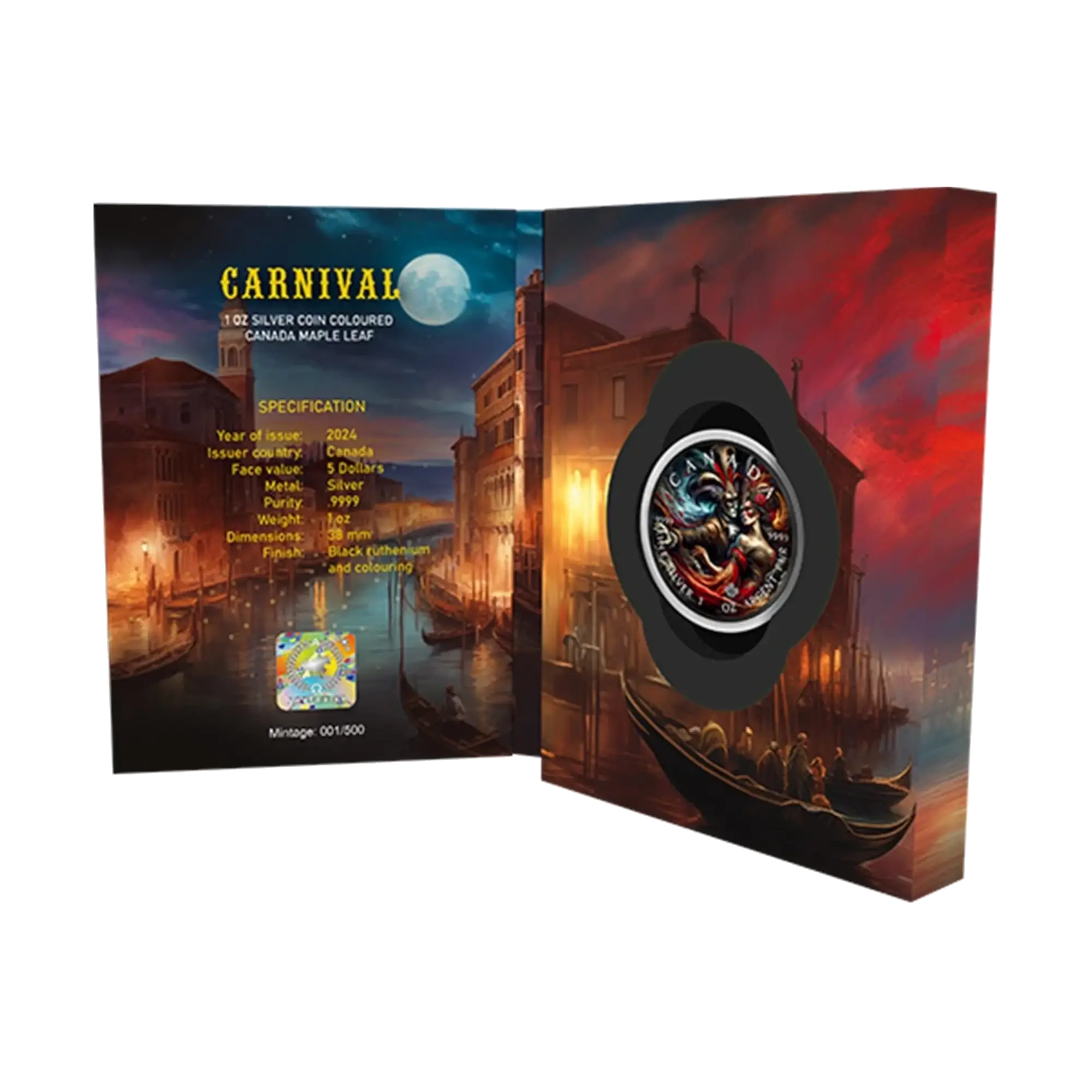 This 1 oz .9999 silver coin uses a Canadian Maple Leaf as its base, enhanced with black ruthenium plating and selective coloring. The reverse depicts a vibrant carnival scene featuring an elegantly masked couple in elaborate period costumes celebrating Shrovetide, the Christian festive season before Lent traditionally marked by masked balls and street parties, while the obverse displays additional carnival imagery. Licensed by Canada with a $5 face value, carnival masks have held historical and social significance since medieval times, allowing anonymous participation in festivities. Limited to just 500 pieces worldwide, each coin arrives in premium thematic blister pack with numbered certificate of authenticity and security hologram.