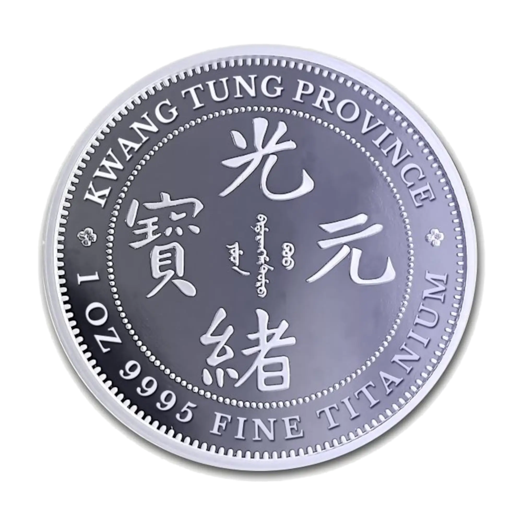Titanium bullion piece featuring the historic Kwang-Tung dragon design inspired by the legendary 1890 Kwang-Tung Dollar from late Qing Dynasty China. The dragon symbolizes power, nobility, and good fortune, rendered with intricate scales and dynamic movement across the surface. Struck in 99.95% pure titanium with brilliant uncirculated finish, combining historical Chinese numismatic artistry with modern alternative metal investment. The obverse includes specifications of weight and purity alongside “Kwang Tung Province” inscription and Chinese characters honoring the historic provincial coinage. Lightweight yet durable titanium offers collectors a distinctive piece rooted in Chinese monetary heritage.