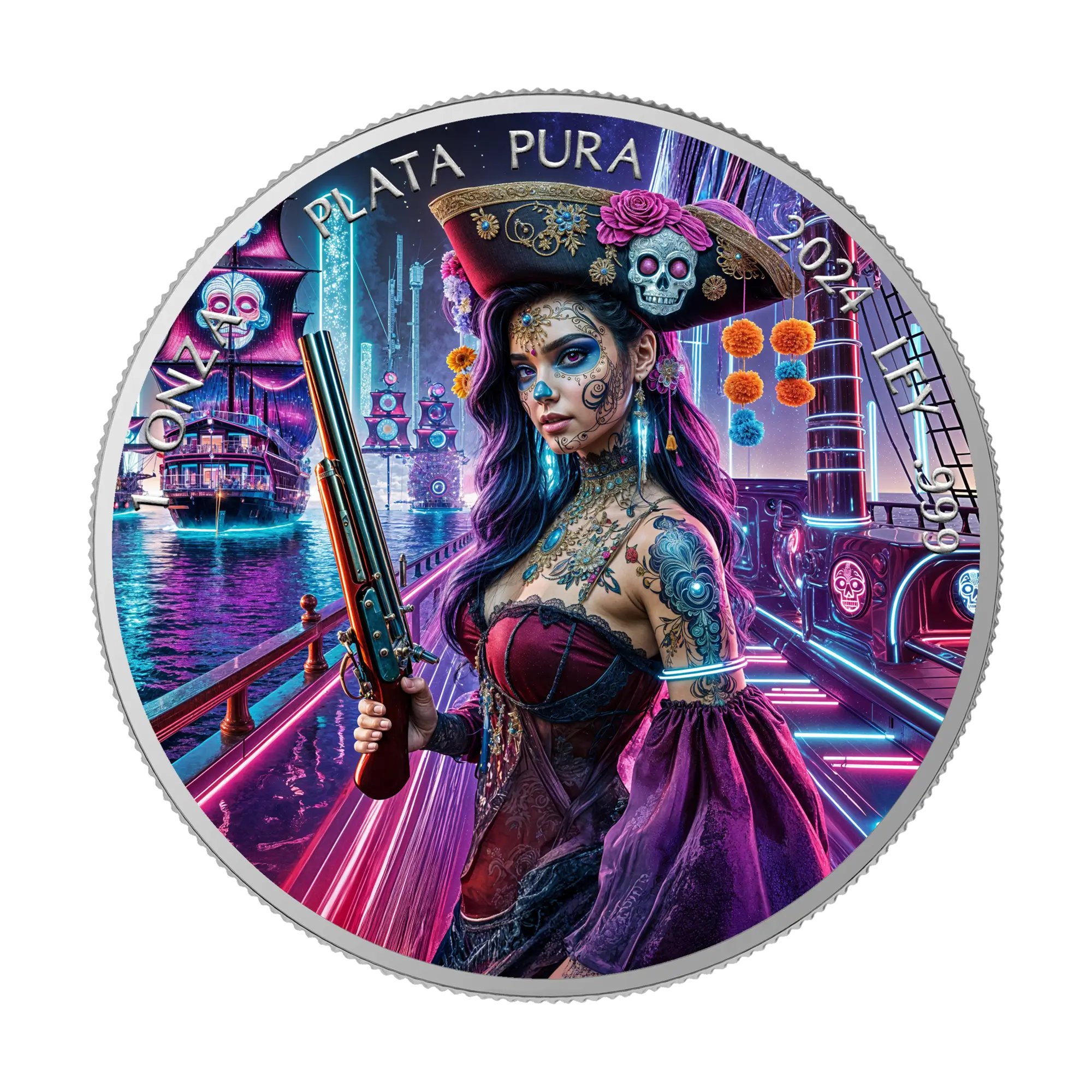 Cyberpunk Pirate Día de los Muertos 2024 Silver Coin 1 oz Mexico Colored