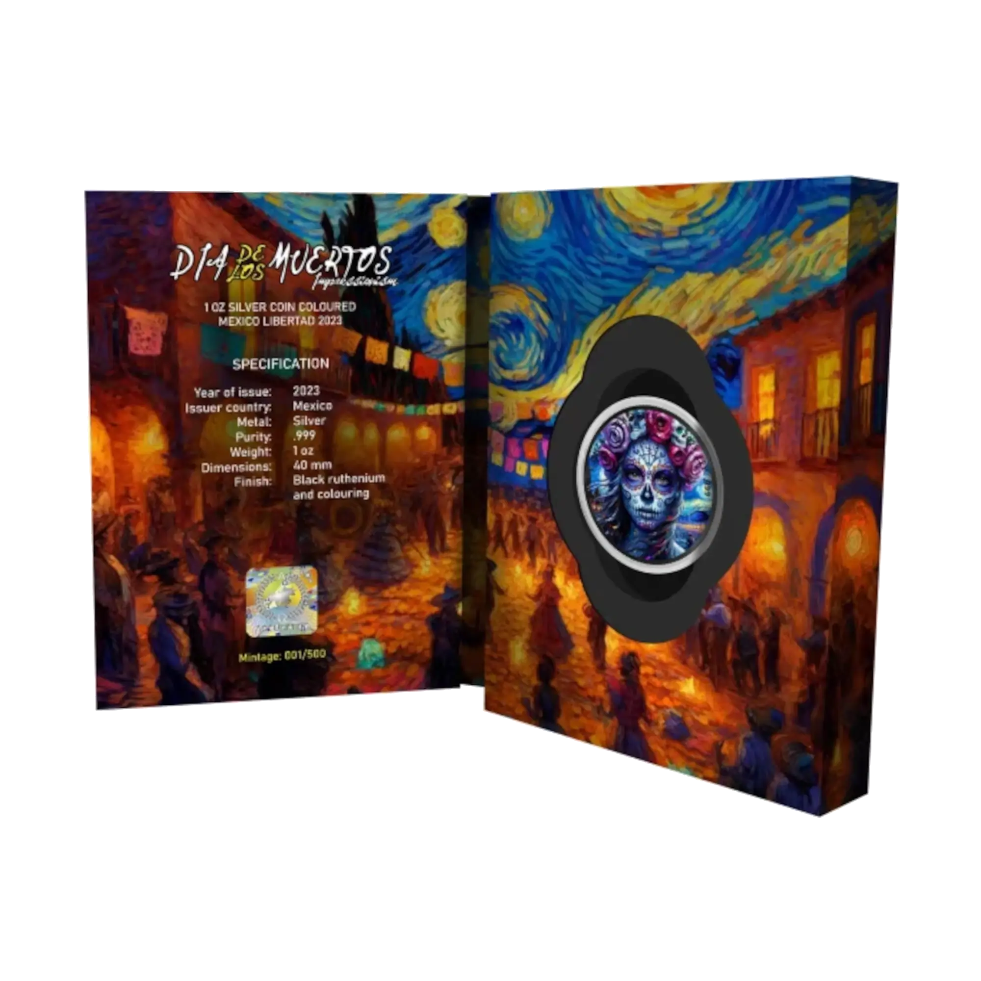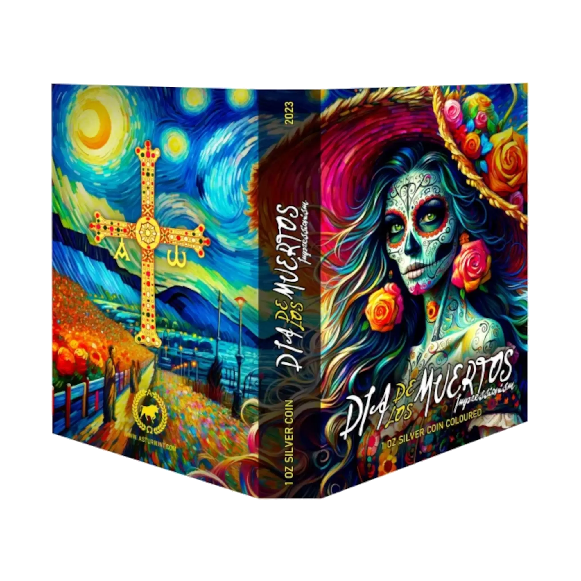 This 1 oz .999 silver coin uses a Mexican Libertad as its base, enhanced with black ruthenium plating and selective coloring featuring impressionistic brushwork inspired by Vincent van Gogh’s iconic style. The reverse depicts a vibrant female calavera adorned with colorful floral and geometric Day of the Dead face paint reminiscent of Starry Night and Sunflower Field, while the obverse shows another intricately designed skull with blue and purple accents surrounded by roses. Licensed by Mexico, this artistic tribute merges cultural heritage with post-impressionist brilliance. Limited to just 500 pieces worldwide, each coin arrives in presentation case with certificate of authenticity.
