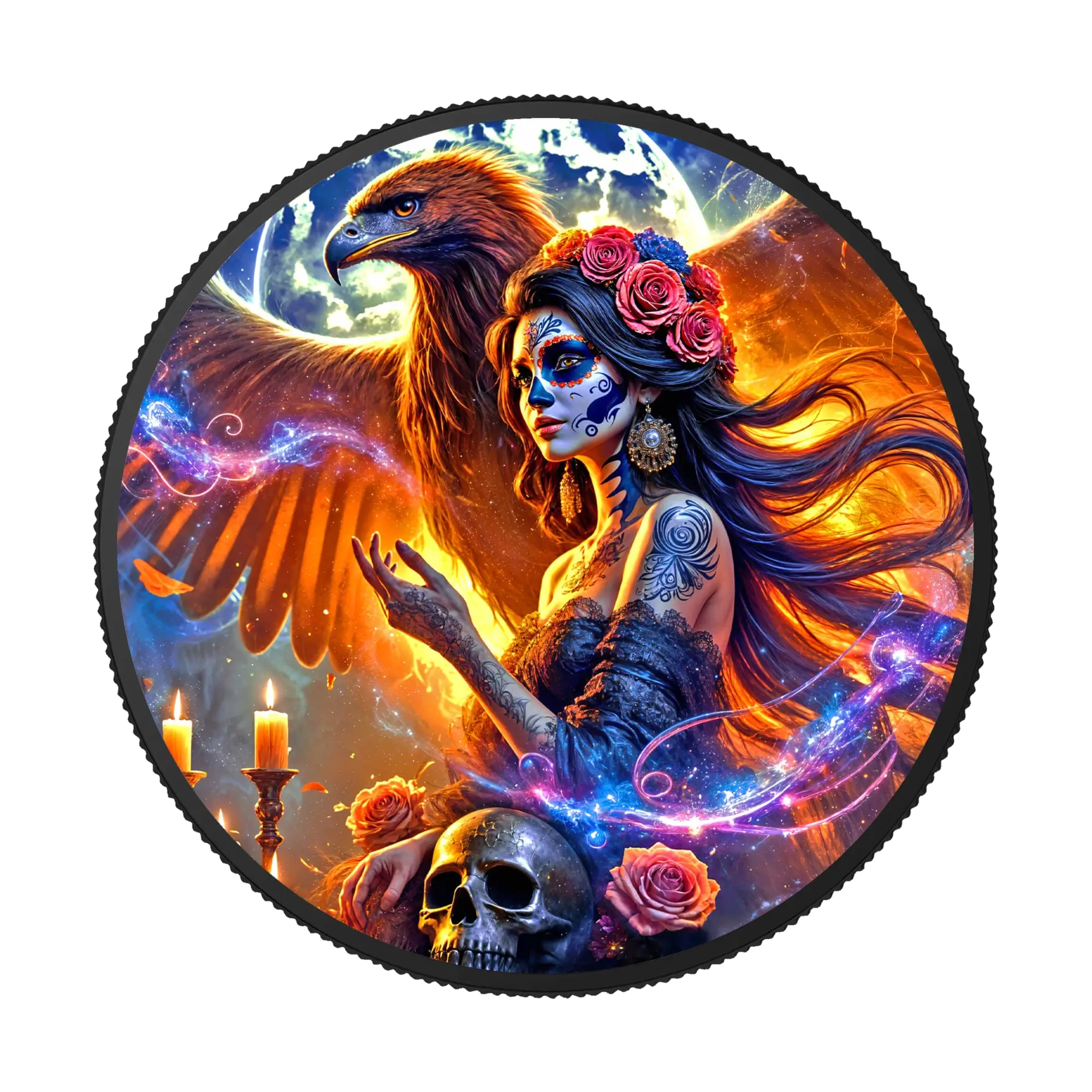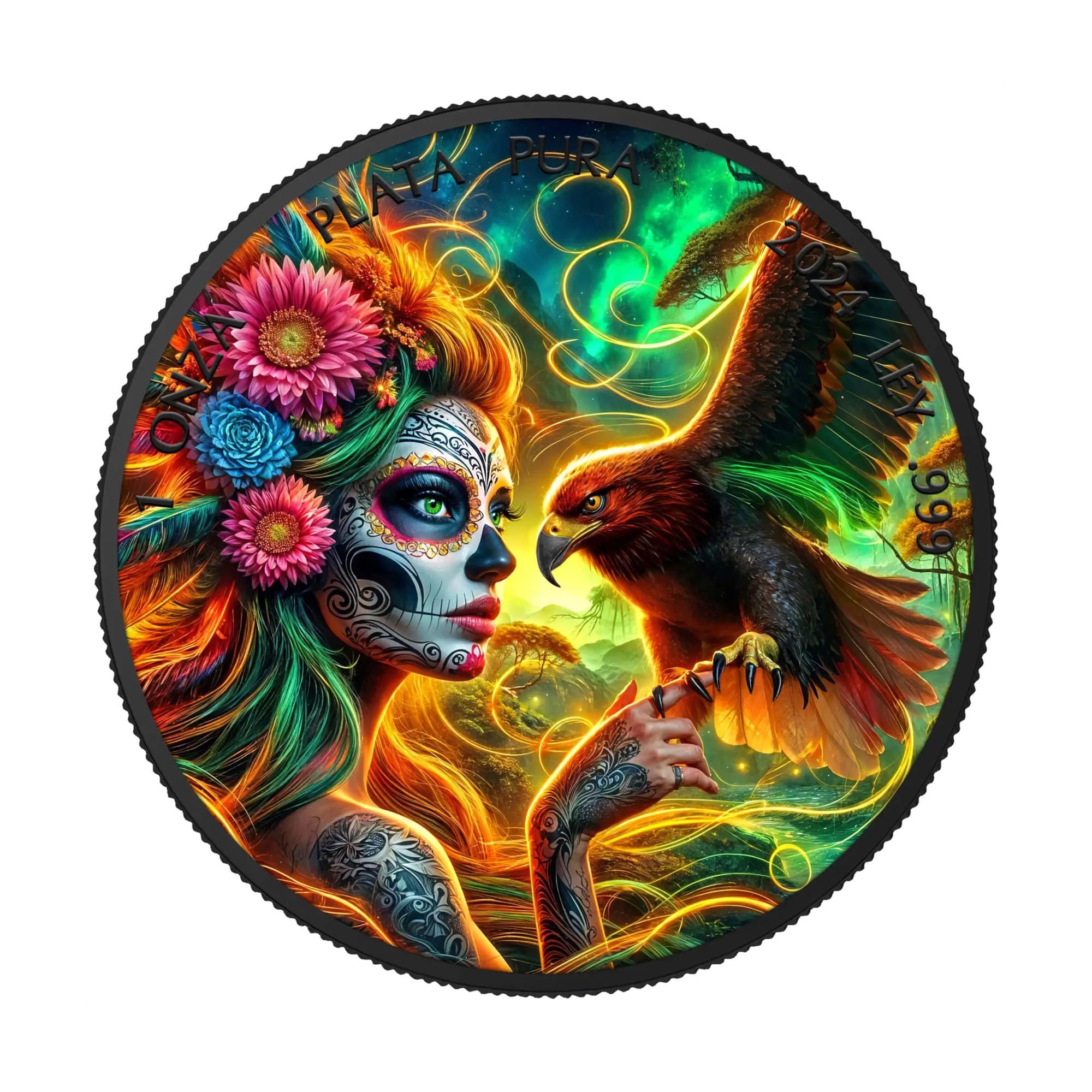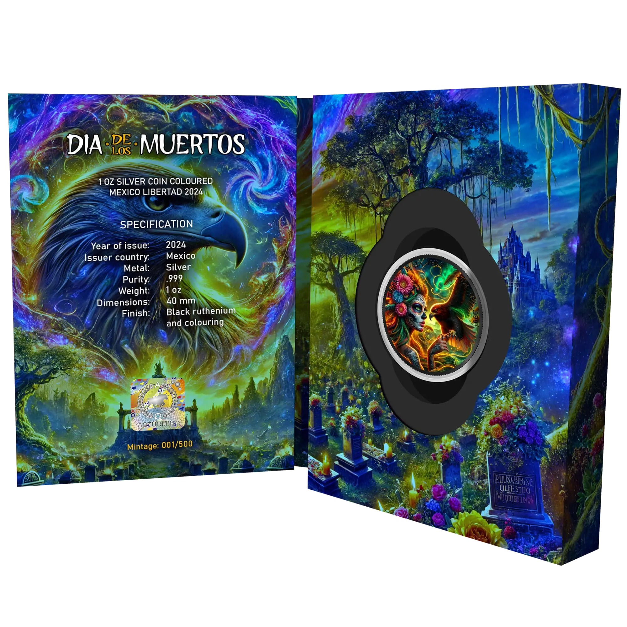1 oz .999 silver colorized coin with black ruthenium plating, brilliant uncirculated condition. Obverse: majestic tiger amid mystical landscape embellished with intricate patterns, surrounded by butterflies and flowers, detailed craftsmanship highlighting black ruthenium finish. Reverse: captivating woman adorned with skeletal calavera makeup epitomizing Día de los Muertos spirit, enriched striking background with rich floral motifs enhancing elegance, “1 ONZA PLATA PURA,” “LEY .999,” year 2024. Mexican Libertad base celebrating Mexico’s famous Day of the Dead festival honoring ancestors with vibrant cultural symbolism. Limited mintage of 500 pieces worldwide. Themed display case with Certificate of Authenticity included.