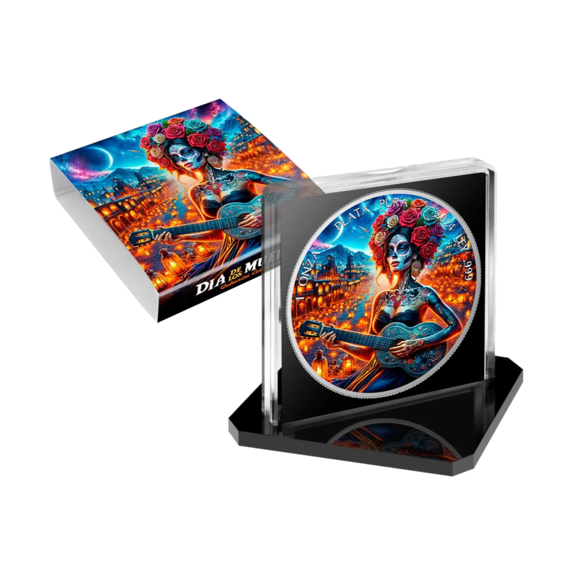 1 oz .999 silver Mexican Libertad base with black ruthenium plating and selective coloring. Reverse: guitarist character with calavera makeup playing guitar, featuring traditional Day of the Dead face paint surrounded by vibrant flowers, musical notes, and cultural symbolism celebrating Mexico’s rich musical heritage and ancestral remembrance. Obverse: Mexico’s coat of arms with eagle on cactus devouring serpent and inscription “Estados Unidos Mexicanos.” Inscriptions include “1 Onza Plata Pura,” year 2024, and “Ley .999.” Part of Día de los Muertos series honoring deceased loved ones through music and festive celebration. Limited mintage, presented in display case with Certificate of Authenticity and unique number.