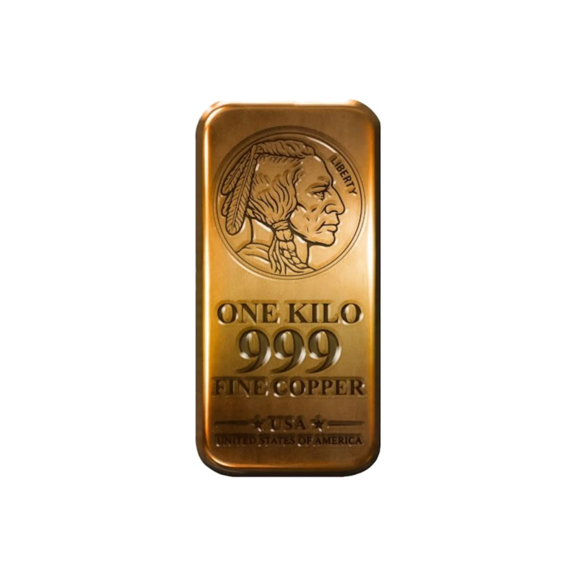 Cast copper bullion bar containing 1 kilogram (32.15 troy oz) .999 fine copper. Features Indian Head profile design inspired by iconic American numismatic imagery, showcasing Native American chief with “LIBERTY” inscription. Design captures dignity and heritage of indigenous American culture through classic coin artistry.