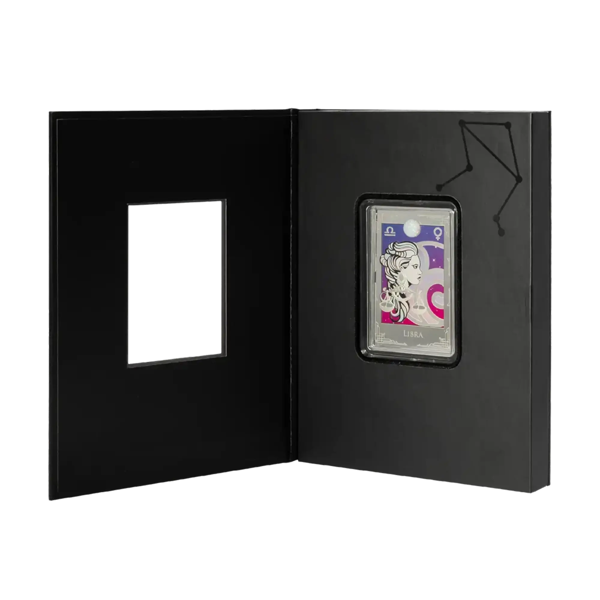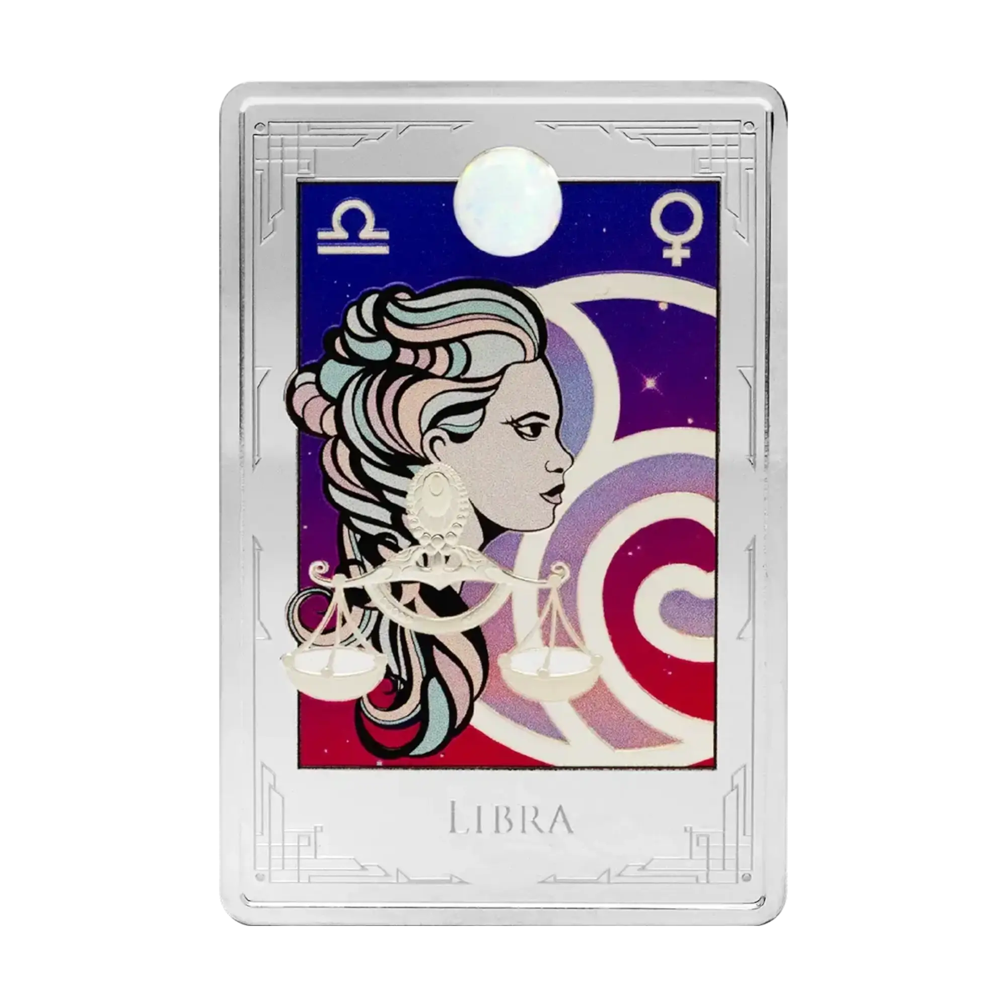 This 2 oz .999 silver proof coin is part of the Star Signs of the Zodiac series, celebrating Libra’s eternal balance and harmony. The reverse depicts the Libra symbol with scales imagery, accompanied by its ruling planet Venus and a radiant gemstone embedded at the center, set against a vibrant colored cosmic background. The obverse features the Public Seal of Niue with “THREE DOLLARS” face value and individual serial number. Limited to 2,000 pieces worldwide, each coin arrives in book-like windowed presentation case with certificate of authenticity.
