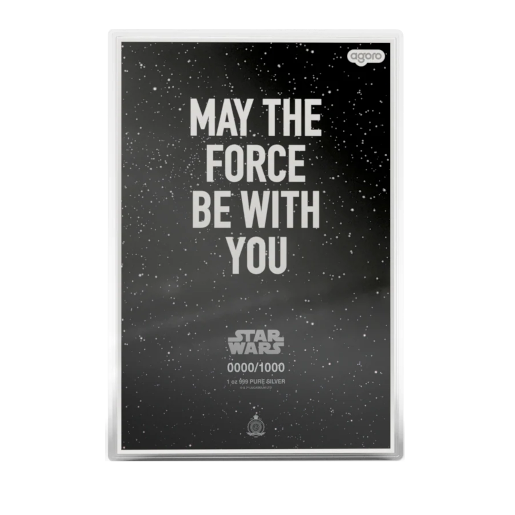 Third release in Agoro’s Star Wars Original Trilogy Poster series capturing the 1983 film. Contains 1 troy oz .999 fine silver foil measuring 175mm x 262mm. Features alternate poster artwork in full color with Luke and Vader duel silhouette, framed by mirror-finish galaxy with frosted stars. Reverse displays frosted Star Wars logo, “May the Force be with you” phrase, and unique number out of 1,000. Legal tender $2 NZD with Public Seal of Niue. Display packaging included. Officially licensed by Lucasfilm.