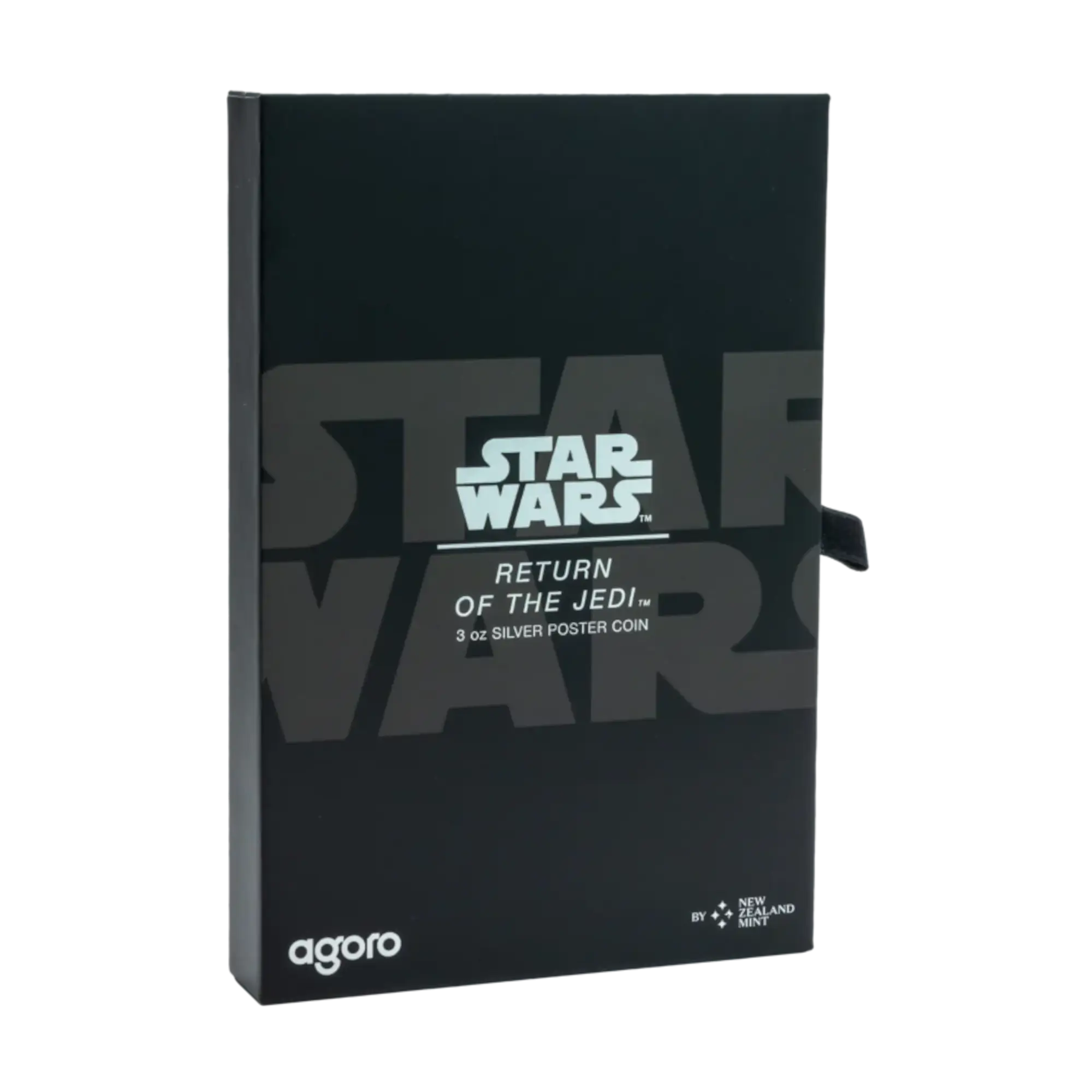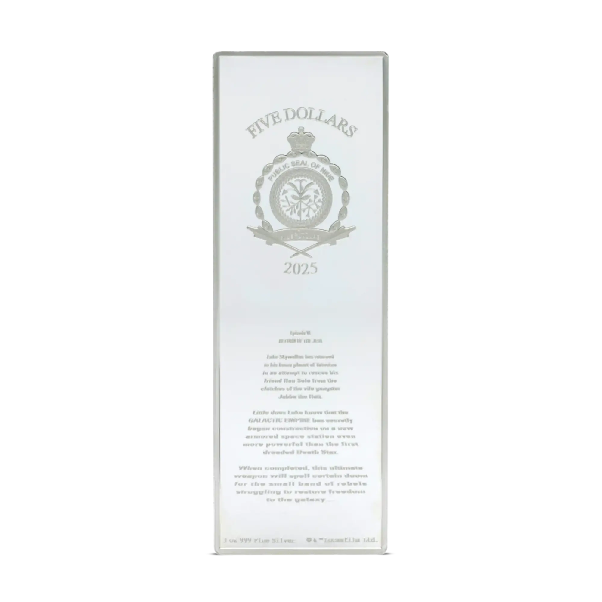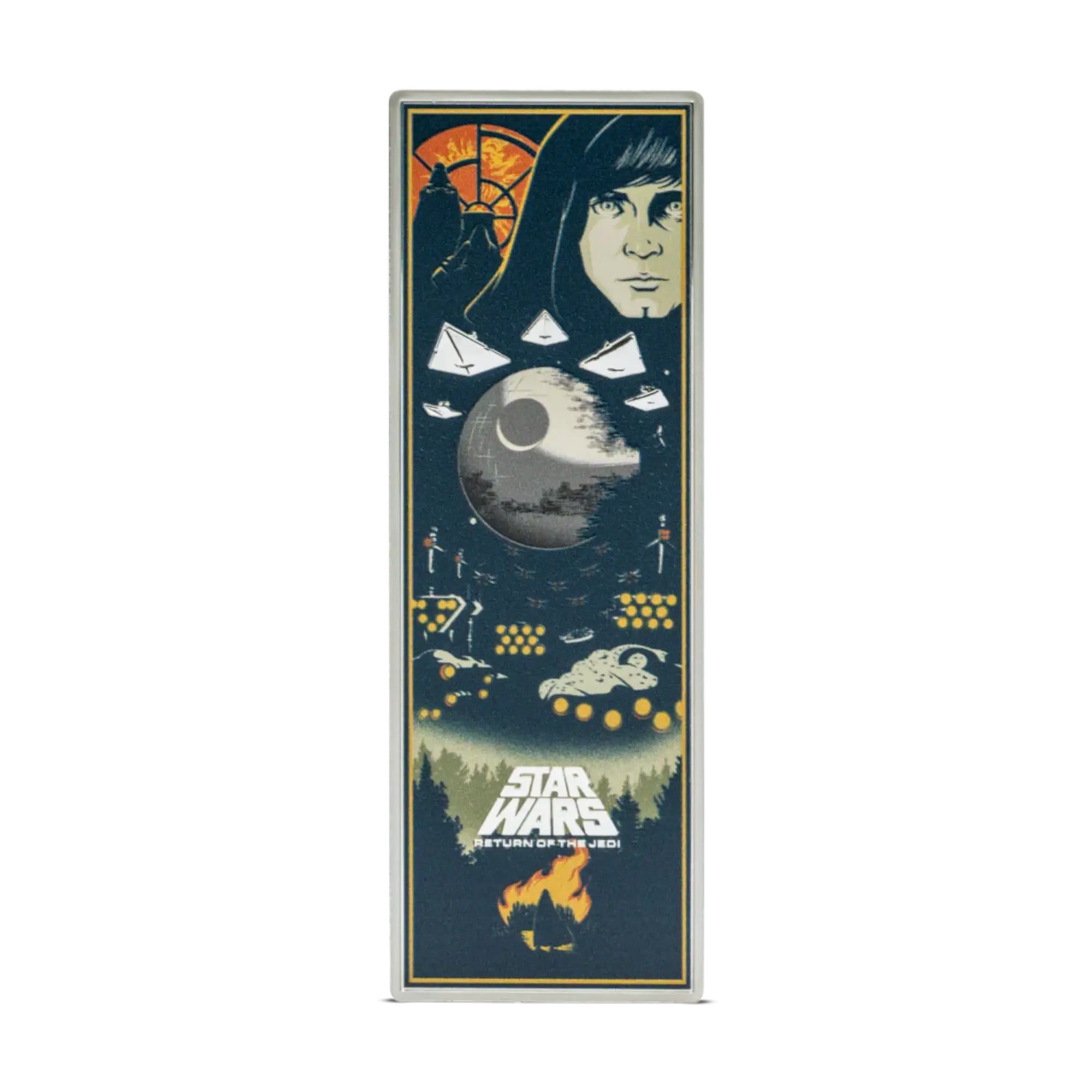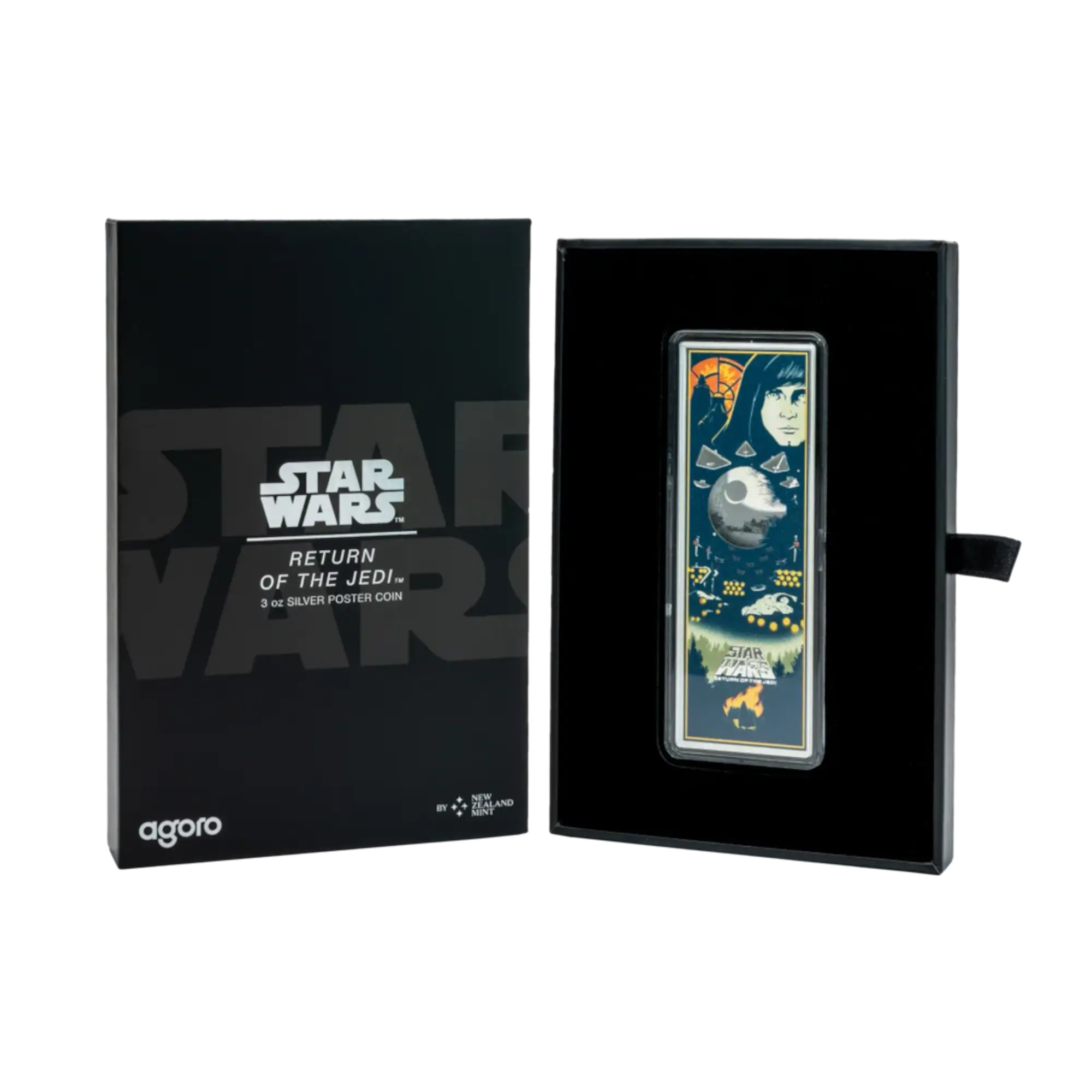 Third release in the Star Wars Poster series, this rectangular coin showcases poster artwork from Return of the Jedi featuring Luke Skywalker, Darth Vader, TIE Fighters, Star Destroyers, and the second Death Star in vivid color. Struck in 99.9% pure silver with proof finish, the design combines color printing with frosted engraving, mirror-finish elements, and relief details. The reverse displays the film’s opening crawl in frosted finish beneath the Public Seal of Niue. Limited mintage of 800 coins. Presented in Star Wars-branded outer box with Certificate of Authenticity featuring the coin’s unique number.