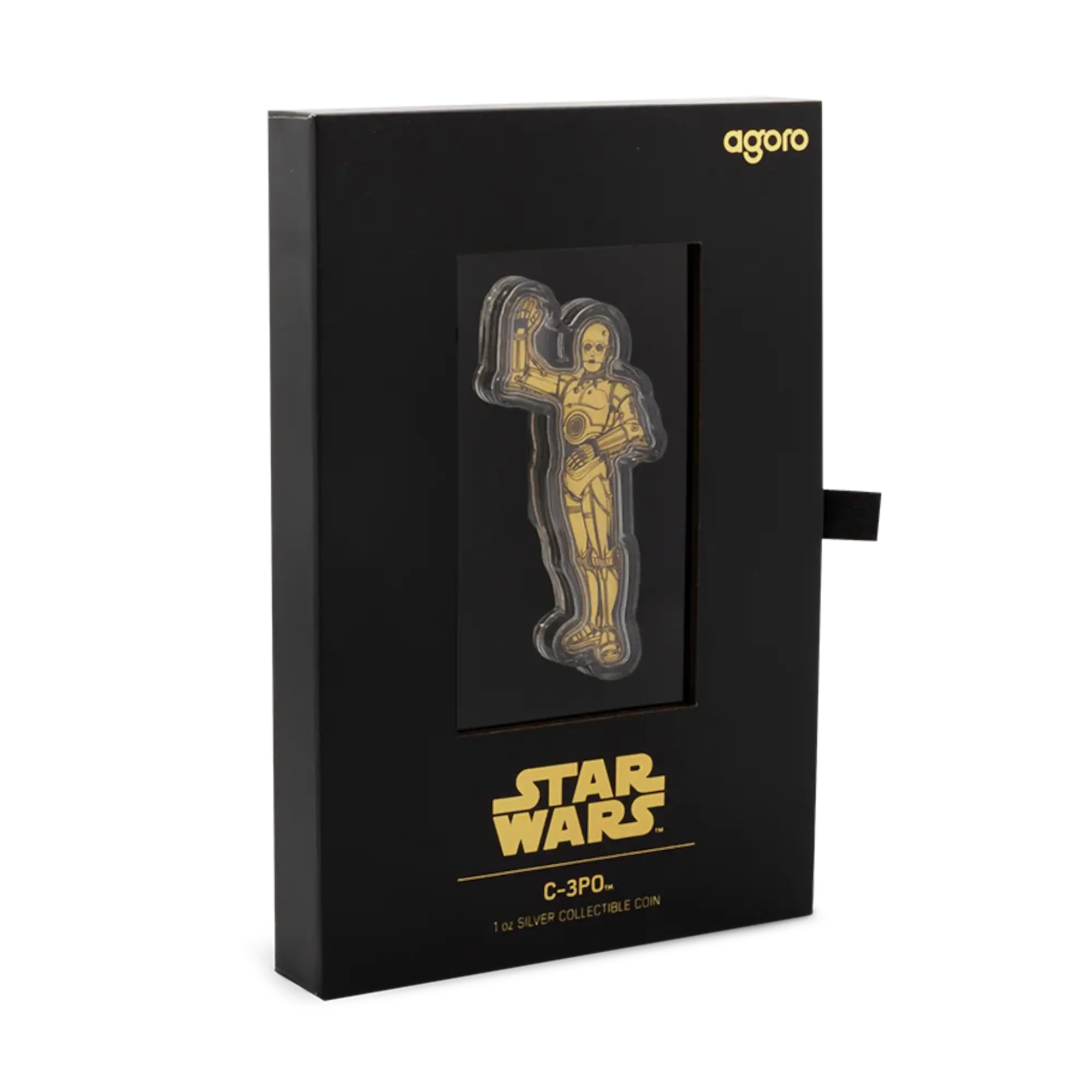 1 oz .999 silver shaped coin measuring 30mm x 68mm, brilliant uncirculated condition with gold gilding and selective colorization. Obverse: Public Seal of Niue with year 2025, $2 face value, Lucasfilm trademark, individually numbered serialization. Reverse: fully shaped on both sides to replicate C-3PO’s iconic humanoid form with meticulous color printing highlighting intricate plating details. First release in Star Wars Droids Series by Agoro (New Zealand Mint), licensed by Lucasfilm for Niue. Protocol droid fluent in over seven million forms of communication, appeared in every major Skywalker saga film. Limited to 2,000 pieces worldwide. Custom Star Wars-branded packaging with display window and Certificate of Authenticity.