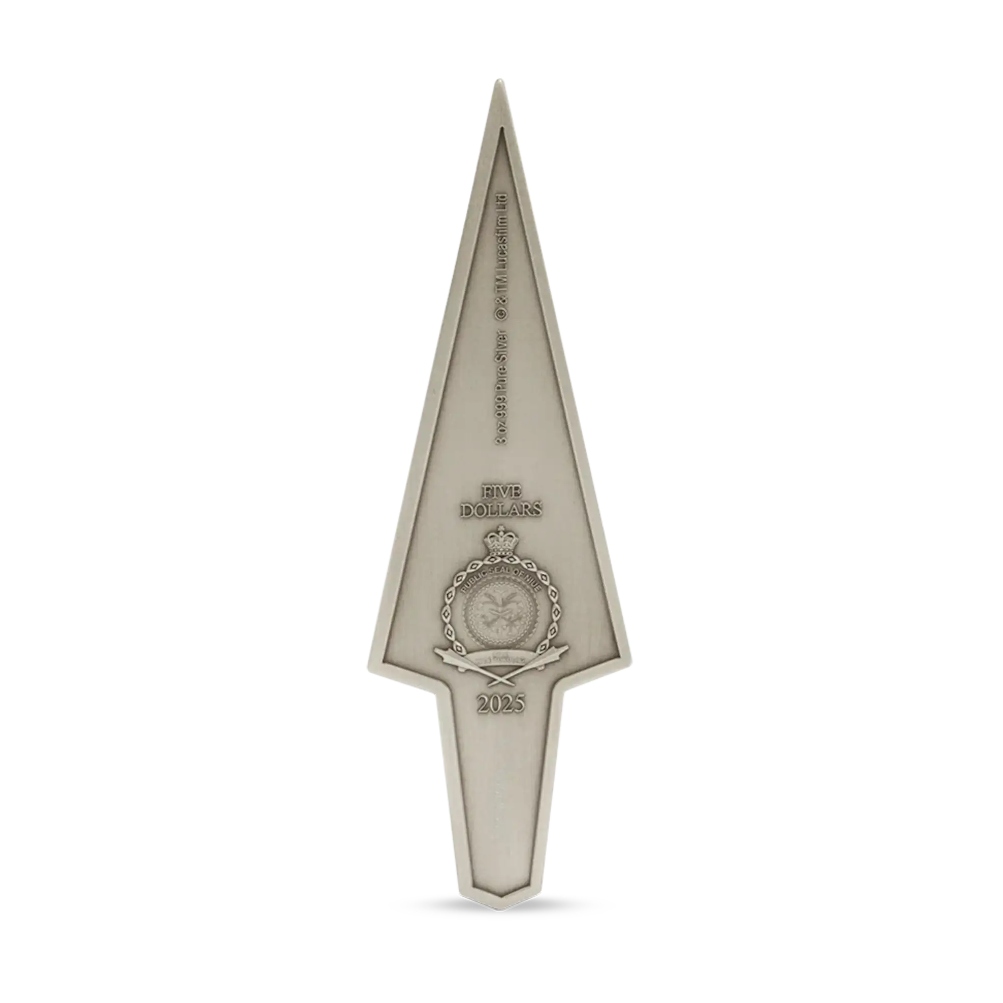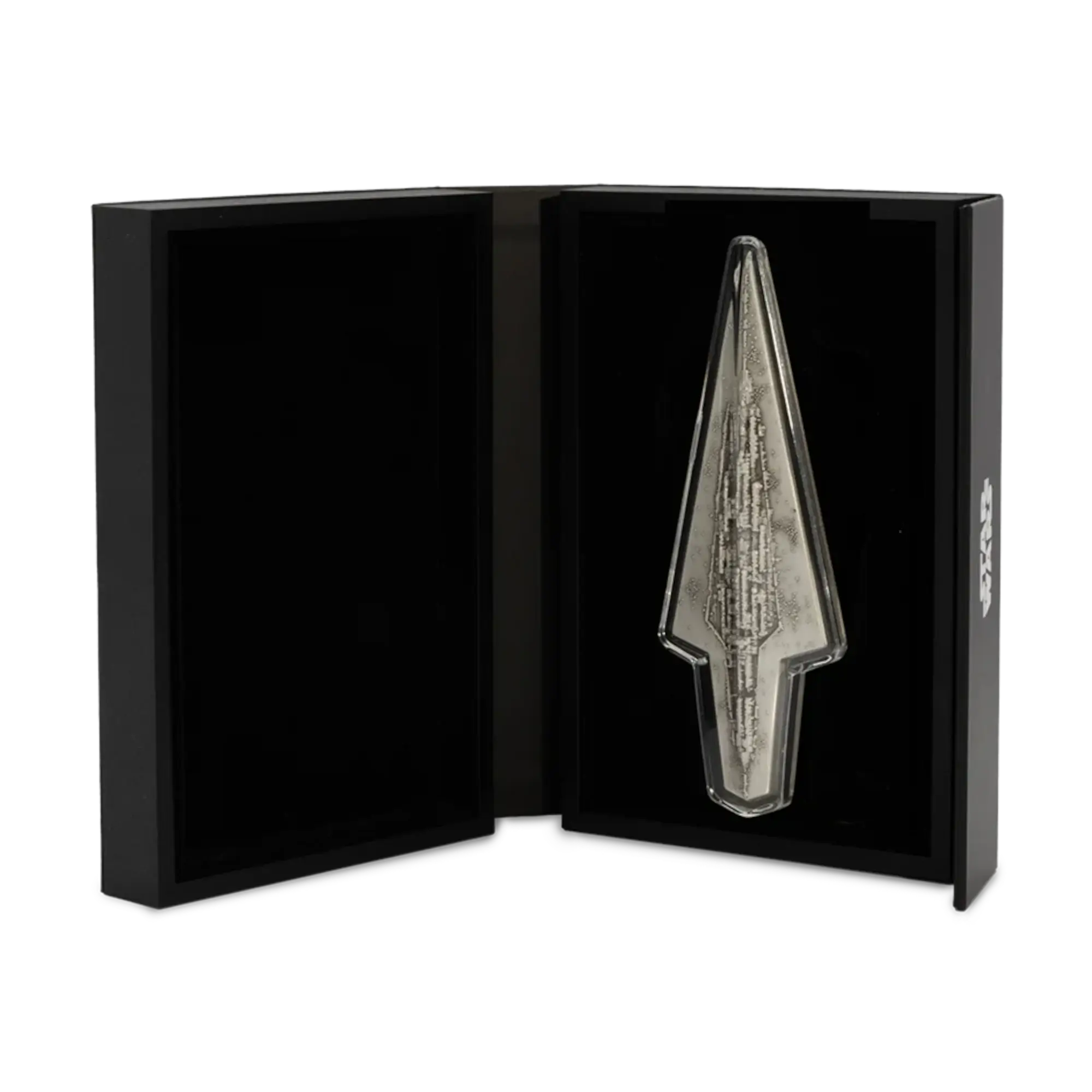 3 oz .999 silver shaped coin with antique finish, brilliant uncirculated condition. Obverse: Public Seal of Niue with native flora encircled by seashells and sovereign crown, year 2025, and $5 face value. Reverse: meticulously detailed engraving replicating Executor Super Star Destroyer’s distinctive dagger-shaped design with surface details, armor plating, turrets, and mechanical structures. Licensed by Lucasfilm and minted by New Zealand Mint for Niue. Darth Vader’s personal flagship measuring 19 kilometers long, housing over 280,000 personnel, first appeared in The Empire Strikes Back. Hand-applied antique finish creates weathered battle-worn appearance. Limited to 1,000 pieces worldwide, presented in Star Wars-branded display case with Certificate of Authenticity and unique number.