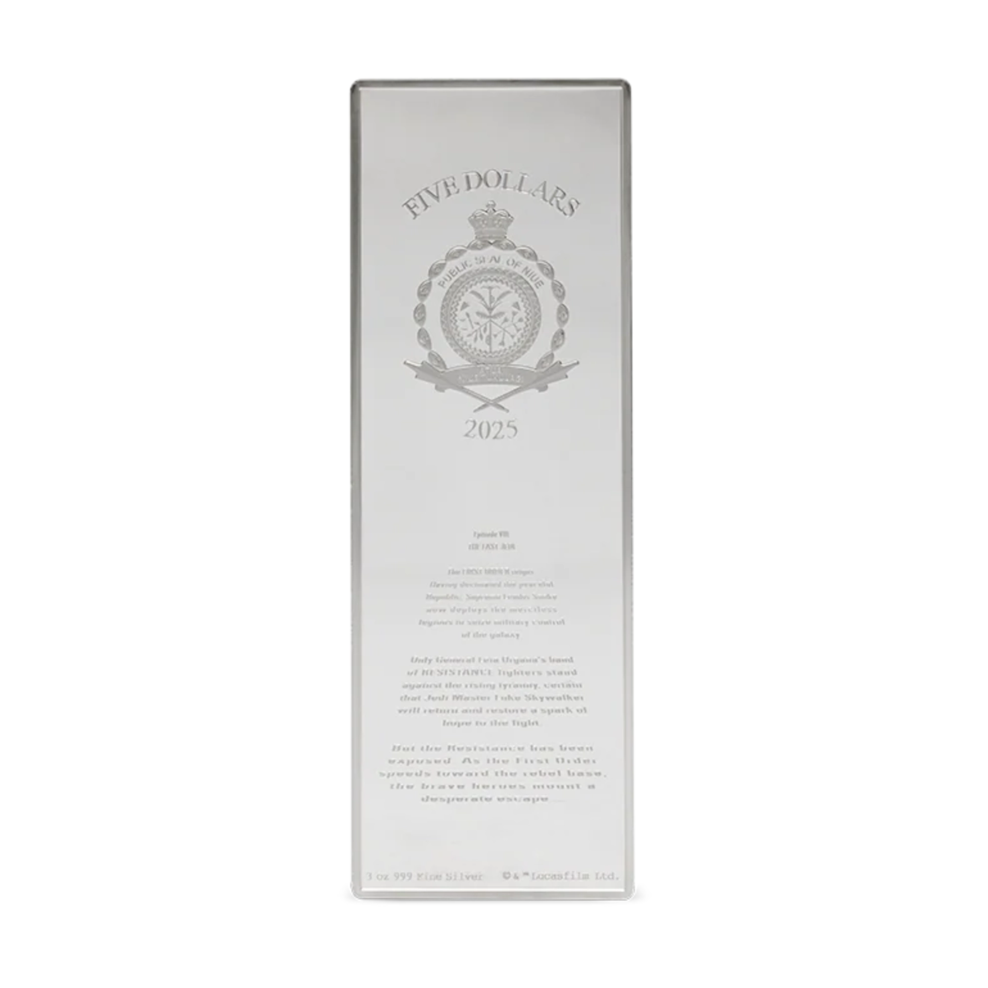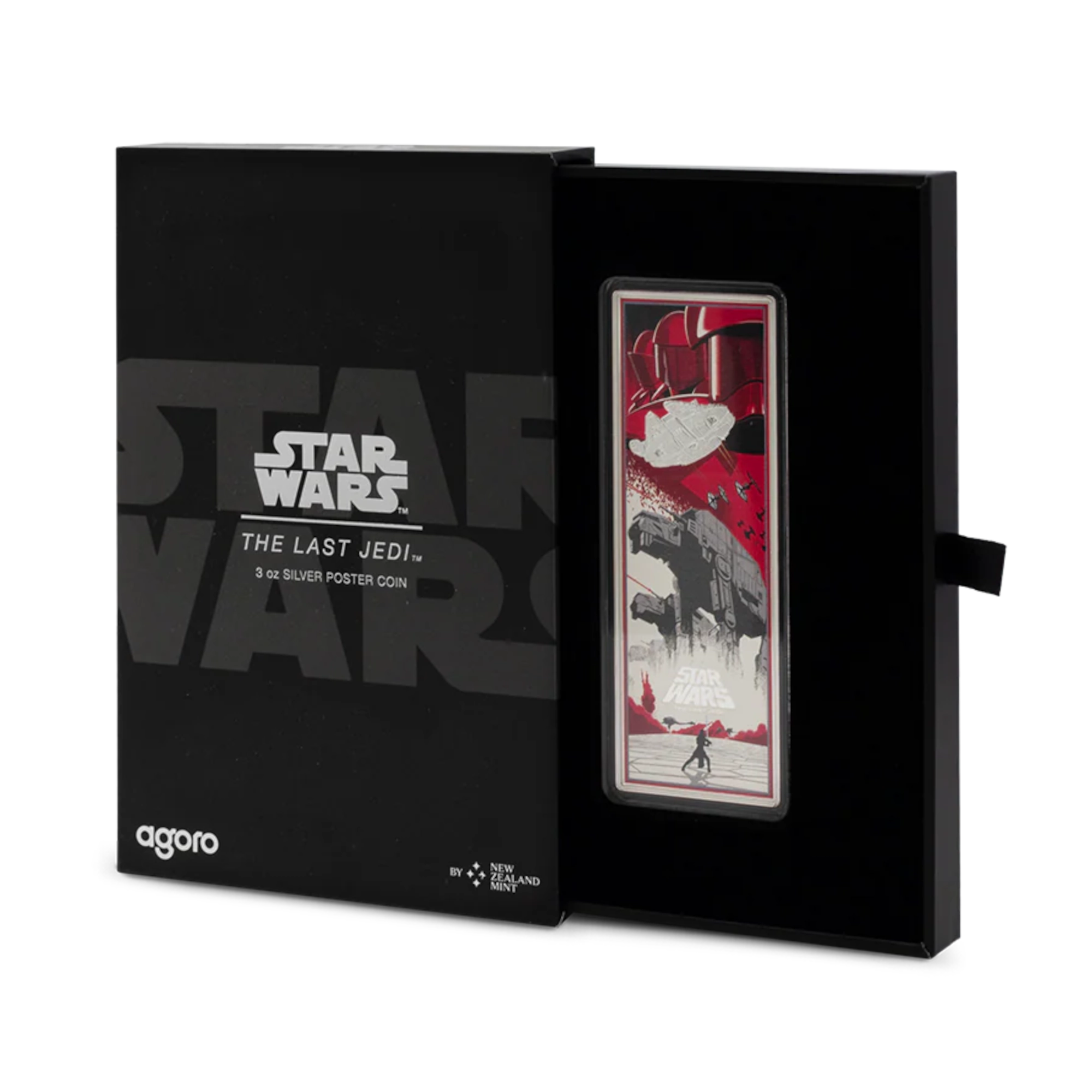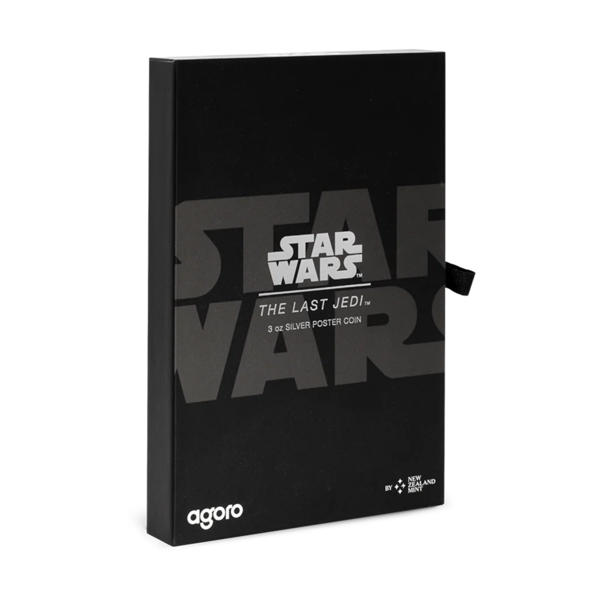 Eighth release in the Star Wars Poster series, this rectangular coin features poster artwork from The Last Jedi showcasing Rey, Luke Skywalker, Kylo Ren, and the Resistance versus First Order conflict. Struck in 99.9% pure silver with proof finish, the design displays vivid color printing combined with frosted engraving, mirror-finish fields, and high-relief elements. The reverse includes the film’s opening crawl beneath the Public Seal of Niue. Limited mintage of 800 coins. Presented in Star Wars-branded outer box with Certificate of Authenticity featuring the coin’s unique number.