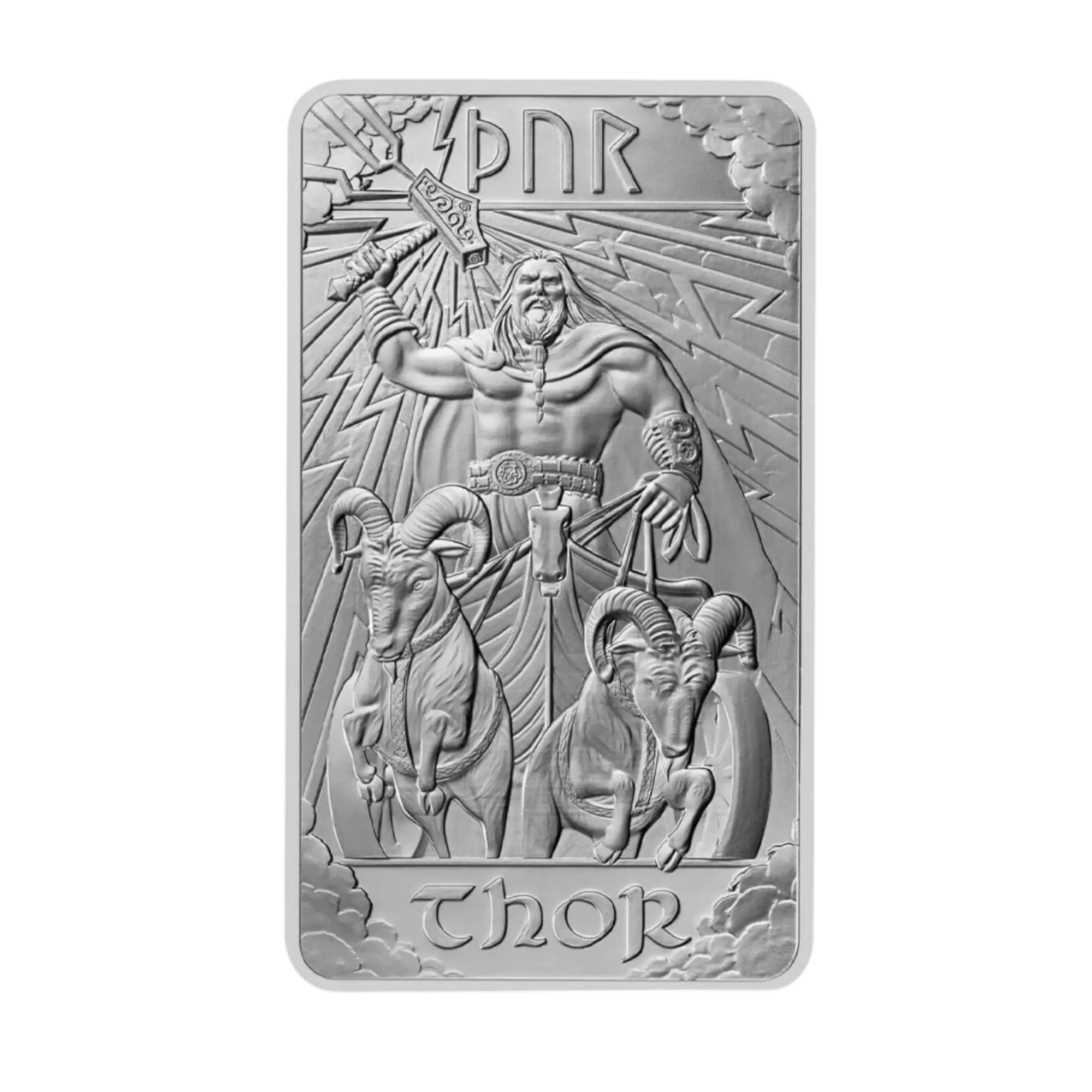 Second release in Norse Gods series, collaboration between The Royal Mint and Germania Mint. Reverse depicts Thor, god of thunder and son of Odin, riding chariot pulled by mighty goats Tanngrisnir and Tanngnjóstr racing through sky at tremendous speed, wielding legendary hammer Mjöllnir raised above head ready to dispense justice, lightning bolts streaking in background. Eyes full of determination portraying invincible warrior protecting gods and humans throughout nine realms. Obverse features Royal Mint emblem with weight, purity markings, and Norse-style dragon design. Arrives in secure CardBar packaging from Germania Mint.