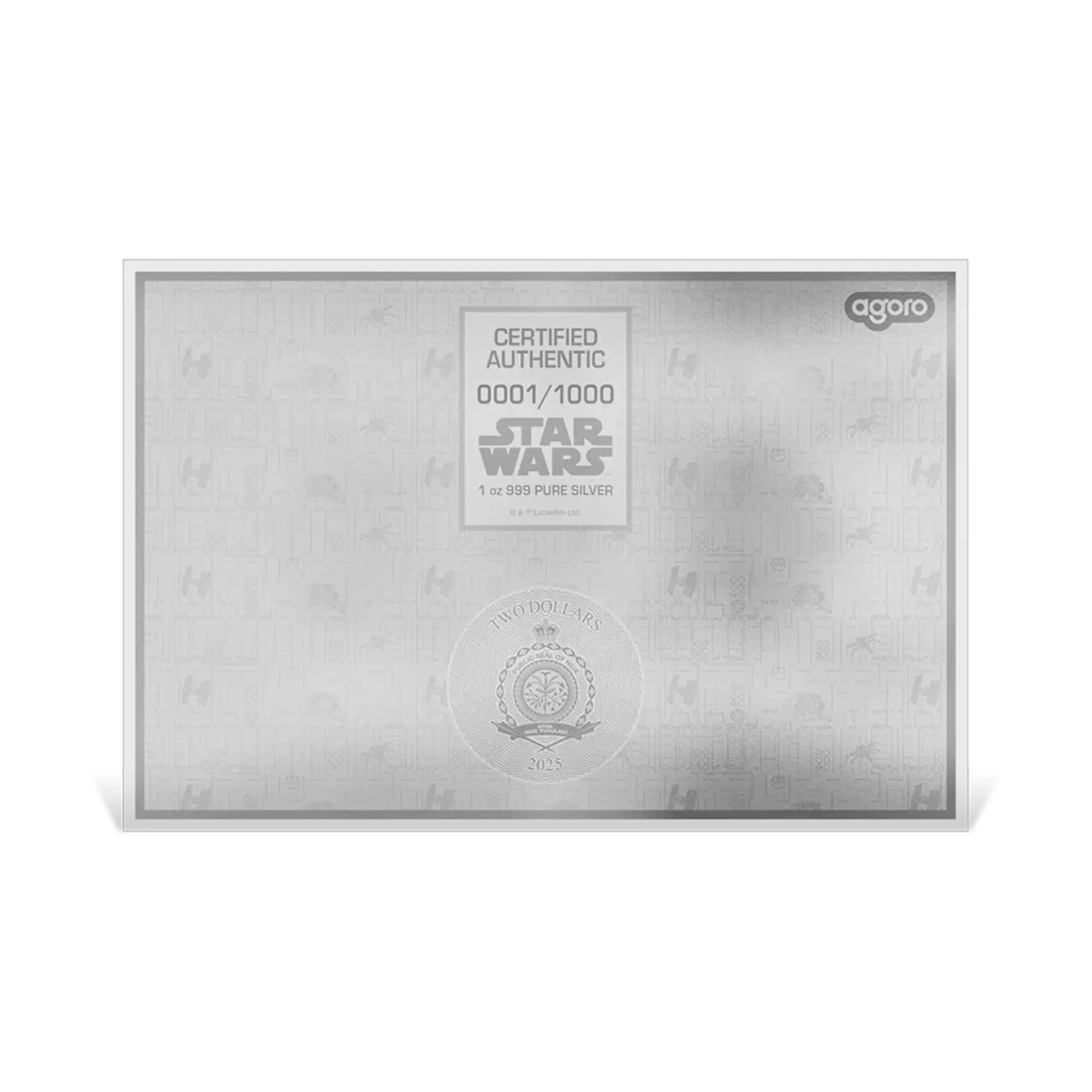 1 oz .999 silver foil with brilliant uncirculated finish and selective colorization. Reverse: TIE/SF (Special Forces) starfighter technical blueprint in frosted engraving against vibrant blue background with red callout lines connecting technical designations, inscription “TIE FIGHTER / SF – SIENAR-JAEMUS FLEET SYSTEMS.” Obverse: Star Wars logo, additional technical graphics, Public Seal of Niue, “TWO DOLLARS,” “2025,” “1 oz 999 PURE SILVER,” individual serial number. Sixth and final release in Star Wars Blueprint series by Agoro. TIE/SF advanced First Order starfighter flown by elite pilots symbolizing Empire’s dominance. Limited 1,000 pieces worldwide. Star Wars-branded packaging, Certificate of Authenticity included.