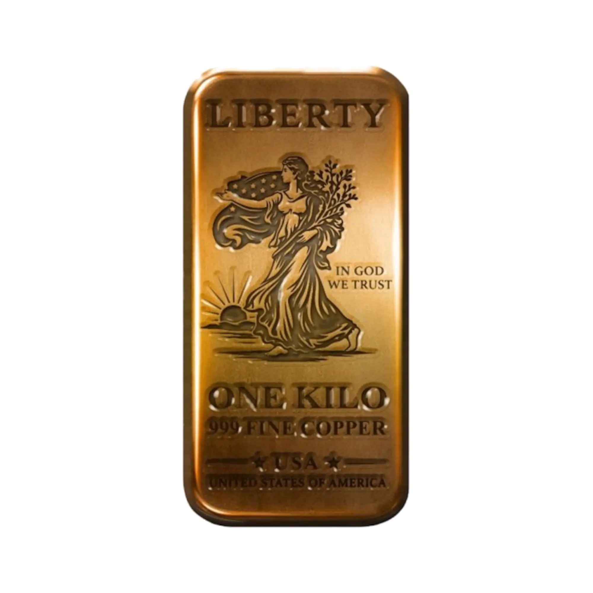 Copper bullion bar containing 1 kilogram (32.15 troy oz) .999 fine copper. Features iconic Walking Liberty design inspired by Adolph Weinman’s 1916 half dollar. Obverse depicts Lady Liberty striding toward sunrise, right arm outstretched, carrying laurel and oak branches, draped in American flag symbolizing freedom and independence. Inscriptions include “ONE KILO,” “COPPER,” “.999 FINE,” and “U.S.A.” Brilliant finish showcasing copper’s natural luster. Investment-grade copper bullion celebrating American patriotism through timeless numismatic artistry.