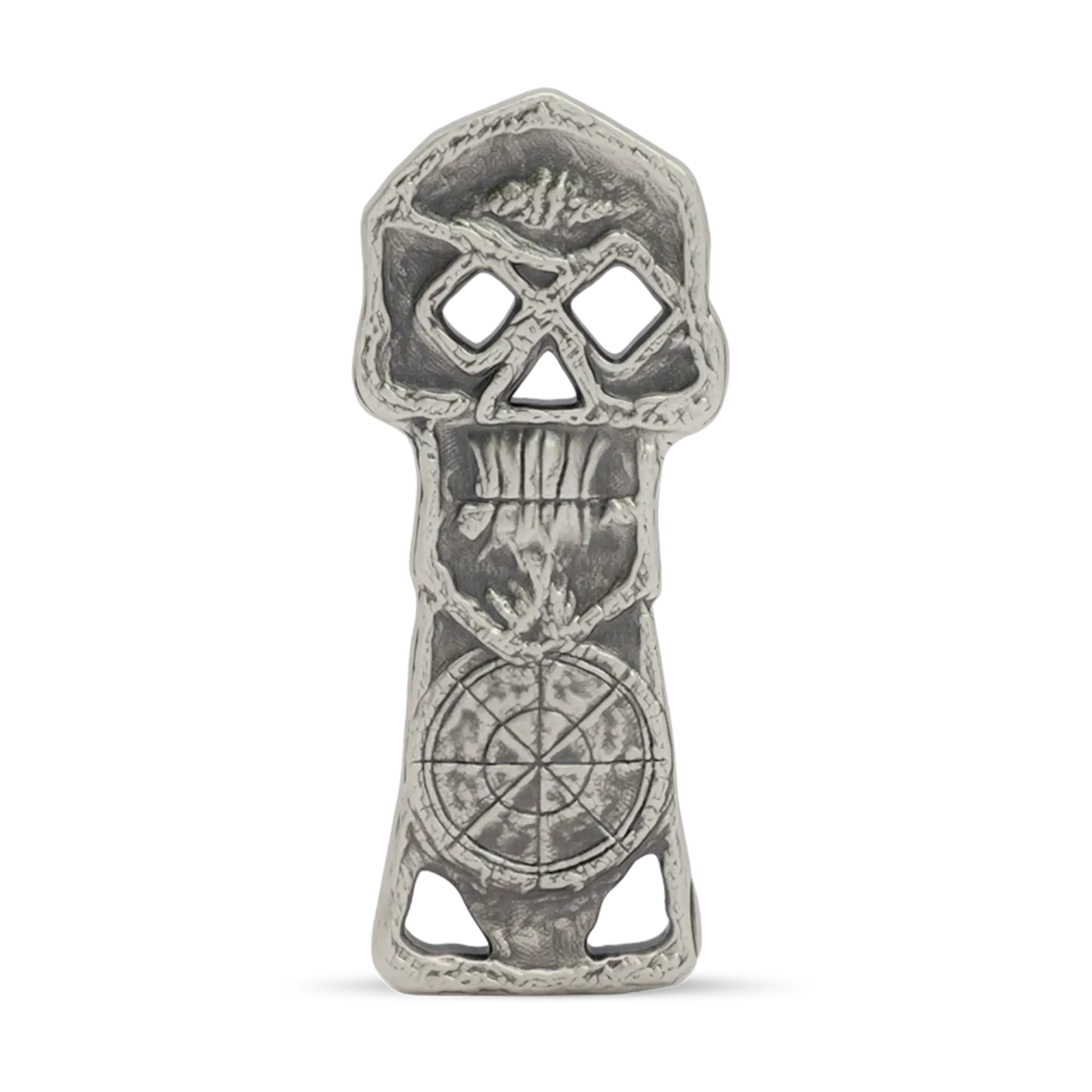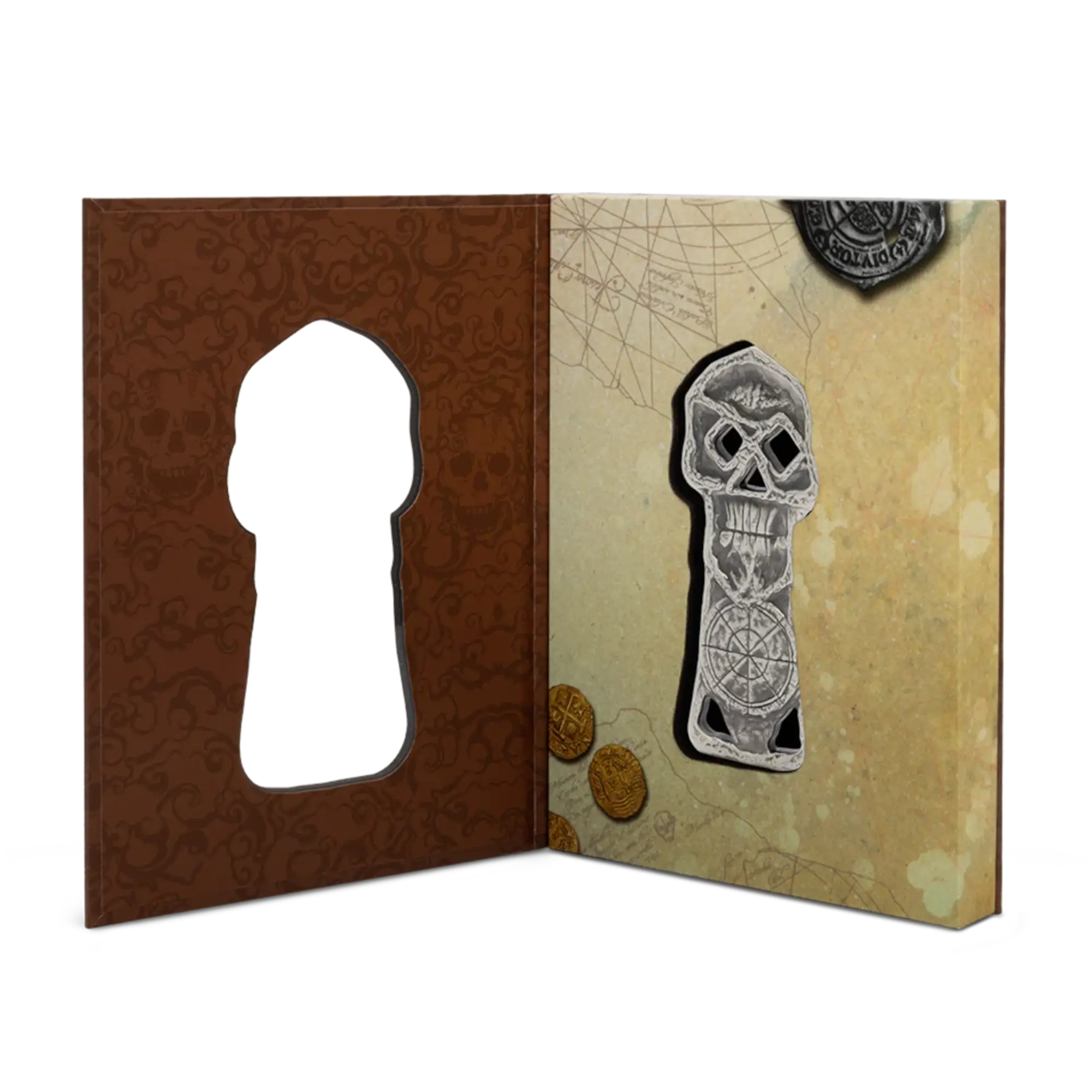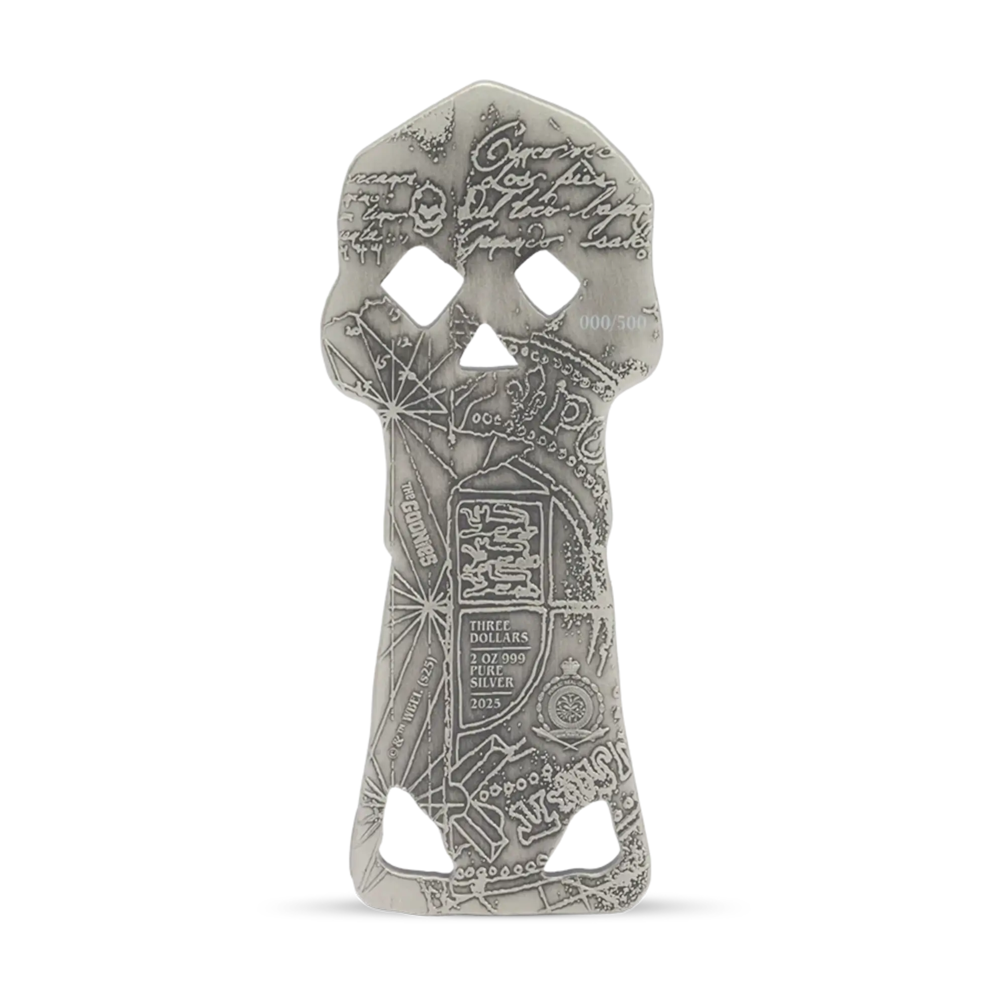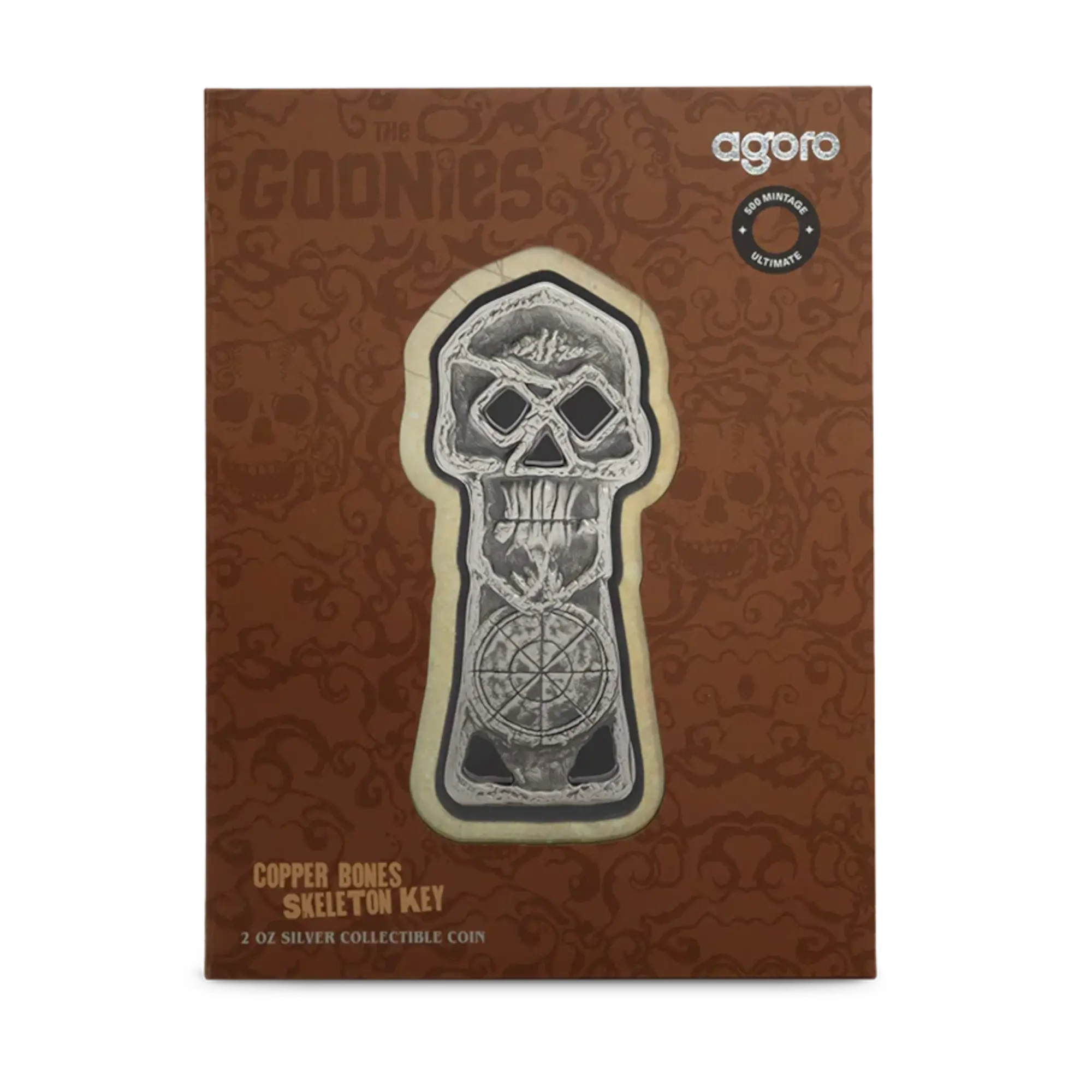 2 oz .999 silver antiqued proof coin shaped as skeleton key. Design: carefully shaped and engraved replica of Copper Bones Skeleton Key with punched-out holes, detailed engraving capturing every element, aged antique finish adding timeworn weathered appearance resembling film relic. Obverse: individual serial number, Public Seal of Niue, “$3,” “2025.” From 1985 cult classic The Goonies directed by Richard Donner, key essential for unlocking treasure map making it one of film’s most iconic items in Mikey’s search for One-Eyed Willy’s treasure. Limited 500 pieces worldwide. Custom Goonies-themed display case styled like Astoria Goondocks, Certificate of Authenticity included.